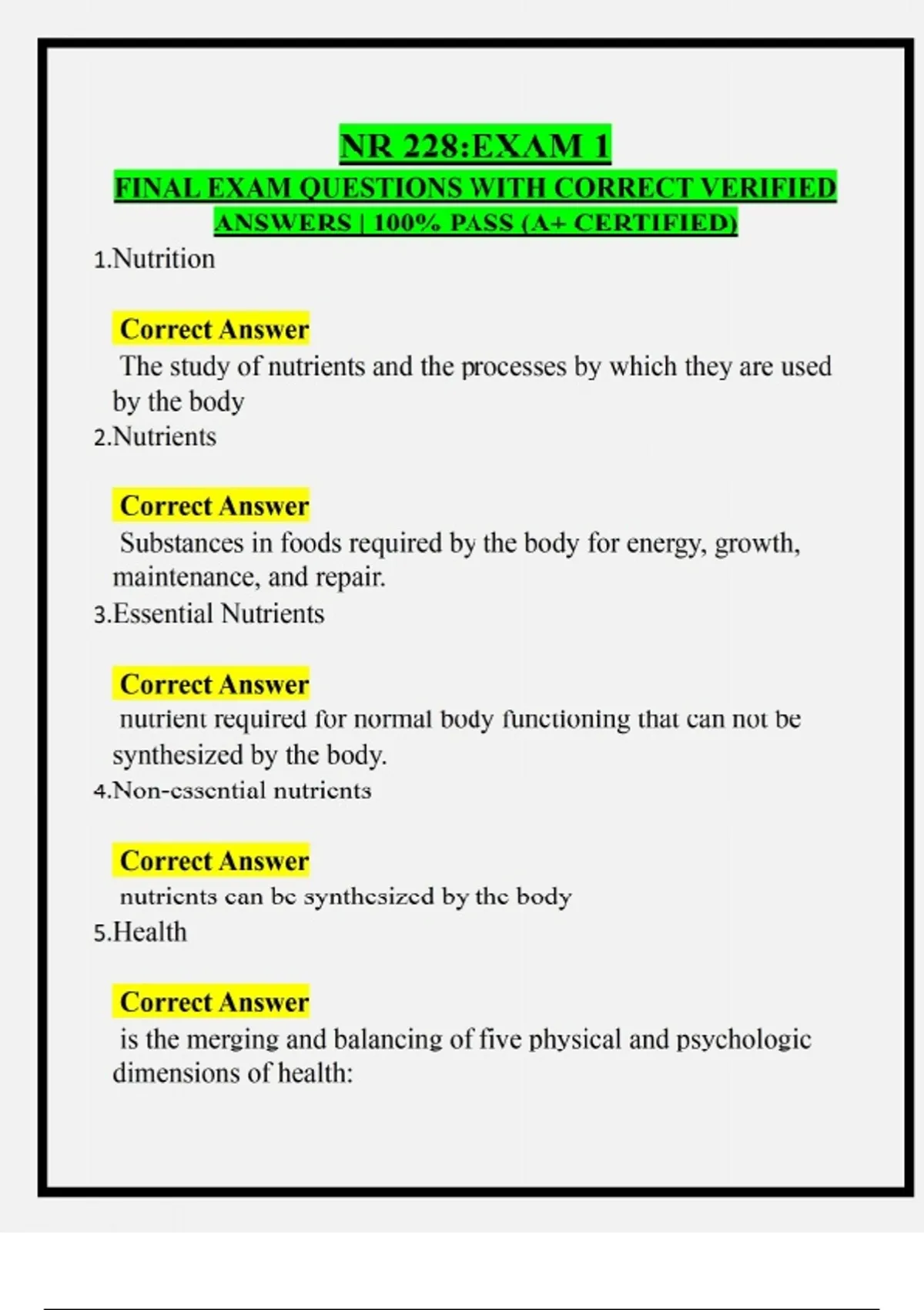 NR 228:EXAM 1 FINAL EXAM QUESTIONS WITH CORRECT VERIFIED ANSWERS | 100% PASS (A+ CERTIFIED) 1. Nutrition Correct Answer The study of nutrients and the processes by which they are used by the body 2. Nutrients Correct Answer Substances in foods required by the body for energy, growth, maintenance, and repair. 3. Essential Nutrients Correct Answer nutrient required for normal body functioning that can not be synthesized by the body. 4. Non-essential nutrients Correct Answer nutrients can be synthesized by the body 5. Health Correct Answer is the merging and balancing of five physical and psychologic dimensions of health: physical, intellectual, emotional social spiritual. 6. Types of health: Physical Health Correct Answer The efficiency of the body to function appropriately, to maintain immunity to disease, and to meet daily energy requirements 7. Types of health: intellectual health Correct Answer The use of intellectual abilities to learn and to adapt to changes in one's environment 8. Types of health: Emotional health Correct Answer The capacity to easily express or suppress emotions appropriately 9. Types of health: Social health Correct Answer The ability to interact with people in an acceptable manner and sustain relationships with family members, friends, and colleagues 10. Types of health: Spiritual health: The cultural beliefs that give purpose to human existence, found through faith in the teachings of organized religions, in an understanding of nature or science, or in an acceptance of the humanistic view of life 11. Types of health: Environmental health Correct Answer The external factors that affect our health and well-being, including the physical context within which one lives and works as affected by determinants of ethnicity, education, income, and occupation; and extending to the larger environment of safeguarding natural resources to reduce exposure to preventable hazards. 12. Wellness Correct Answer is a lifestyle that enhances our level of health 13. health promotion Correct Answer consists of strategies used to increase the level of health of individuals, families, groups, and communities. --Knowledge --Techniques --Community supports 14. disease prevention Correct Answer is the recognition of a danger to health that could be reduced or alleviated through specific actions or changes in lifestyle behaviors. Primary, secondary, and tertiary prevention Role of nutrition 15. Functions of Essential Nutrients in the Body Correct Answer Providing energy Regulating body processes Aiding growth and repair of body tissues 16. Kcal value- Protein- Correct Answer 4 17. Kcal value- Carbs: 4 18. KcalvalueLipids(fats): 9 19. Kcal Value- Alcohol: 7 20. Carbohydrates Correct Answer organic compounds composed of carbon, hydrogen, and oxygen in the form of simple carbohydrates or sugars Source of energy, sweetness, and dietary fiber -----------------------------------------------Major source of energy and dietary fiber Simple carbohydrates found in fruits, milk, and sweeteners Complex carbohydrates found in cereals, grains, fruits, and vegetables All except dietary fiber broken down to units of glucose Glucose: most efficient form of energy for body 21. food source of carbs Correct Answer Primarily from plants •Divided into two categories •Simple carbohydrates •Complex carbohydrates •Three sizes: •Monosaccharides (Simple) •Disaccharides (Simple) •Polysaccharides (Complex) 22. Monosaccharides Correct Answer Single carbohydrate units. Examples are glucose, fructose and galactose 23. Disaccharides Correct Answer Two single carbohydrates bound together. Examples are Sucrose, maltose, and lactose 24. Polysaccharides Correct Answer Many units of monosaccharides joined together. Starch, Fiber and glycogen 25. carb function in body Correct Answer Provides energy •Dietary fiber•Naturally occurring sweeteners (sucrose and fructose) •Brain and nerve tissues require CHO (glucose) as fuel.•Protein-sparing effect 26. Carbs- digestion Correct Answer Digestive process begins in mouth: Amylase•Breakdown to monosaccharides•Mechanical digestion•Chemical digestion function of enzymes 27. Carbs-absorption Correct Answer Active transport process of glucose •Liver conversion of fructose and galactose to glucose lactose intolerant 28. carbs-metabolism: Blood glucose: source of energy to all cells Metabolism: primarily maintenance of blood glucose homeostasis at 70 to 100 mg/dL 29. Glycogen Correct Answer storage form of CHO in liver and muscles