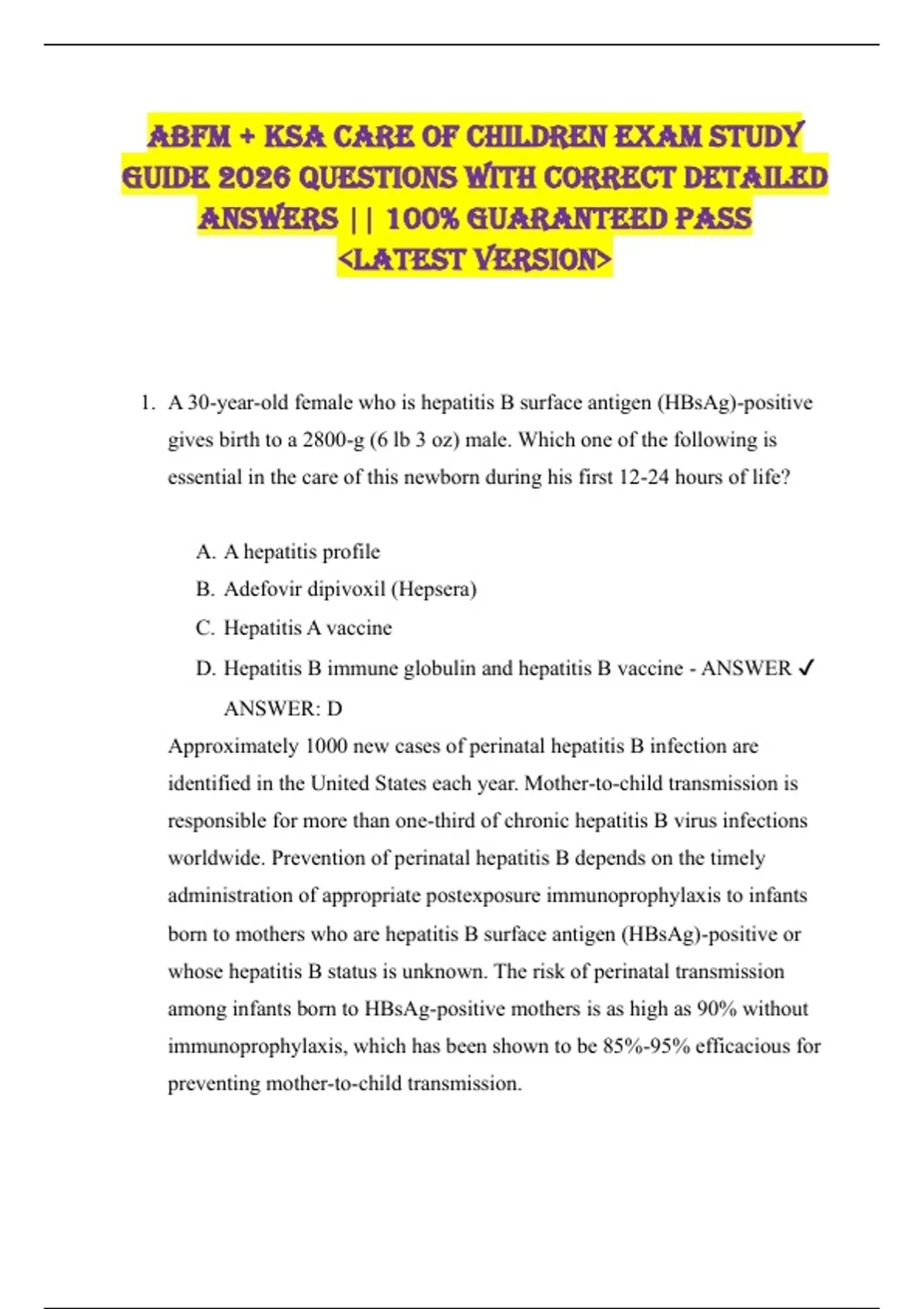 ABFM + KSA CAre oF Children exAM Study Guide 2026 QueStionS with CorreCt detAiled AnSwerS || 100% GuArAnteed PASS &lt;lAteSt VerSion&gt; 1. A 30-year-old female who is hepatitis B surface antigen (HBsAg)-positive gives birth to a 2800-g (6 lb 3 oz) male. Which one of the following is essential in the care of this newborn during his first 12-24 hours of life? A. A hepatitis profile B. Adefovir dipivoxil (Hepsera) C. Hepatitis A vaccine D. Hepatitis B immune globulin and hepatitis B vaccine - ANSWER ANSWER: D Approximately 1000 new cases of perinatal hepatitis B infection are identified in the United States each year. Mother-to-child transmission is responsible for more than one-third of chronic hepatitis B virus infections worldwide. Prevention of perinatal hepatitis B depends on the timely administration of appropriate postexposure immunoprophylaxis to infants born to mothers who are hepatitis B surface antigen (HBsAg)-positive or whose hepatitis B status is unknown. The risk of perinatal transmission among infants born to HBsAg-positive mothers is as high as 90% without immunoprophylaxis, which has been shown to be 85%-95% efficacious for preventing mother-to-child transmission. The American Academy of Pediatrics endorses the recommendation of the CDC's Advisory Committee on Immunization Practices (ACIP) that all newborn infants with a birth weight ≥2000 g (4 lb 7 oz) receive hepatitis B vaccine by 12-24 hours of age. Infants born to mothers who are HBsAg-positive or whose HBsAg status is unknown should receive hepatitis B vaccine and hepatitis B immune globulin in separate limbs within 12 hours of birth. The dosing and administration of these do not require adjustment for birth weight. Infants who receive appropriate immunoprophylaxis may breastfeed immediately after birth. The schedule for subsequent doses of the vaccine depends upon the infant's birth weight. If the birth weight is ≥2000 g, the second and third doses should be given at 1 and 6 months of age, respectively. For infants who weigh &lt;2000 g, three additional doses are required and should be given at 1, 2-3, and 6 months of age, or at 2, 4, and 6 months of age. Since this is prophylactic, treatment of the infant for an active infection with an antiviral medication such as adefovir dipivoxil is unnecessary. A hepatitis profile to check for HBsAg 2. Exclusively breastfed infants have higher rates of which one of the following? A. Leukemia B. Obesity C. Otitis media D. Rickets E. Sudden infant death syndrome - ANSWER ANSWER: D The benefits of breastfeeding are numerous, including reductions in a number of infectious diseases, such as otitis media, respiratory infections, bacterial meningitis, bacteremia, diarrhea, necrotizing enterocolitis, and urinary tract infections. The rates of other adverse health outcomes are also reduced, including sudden infant death syndrome in the first year of life, type 1 diabetes, lymphoma, leukemia, overweight, obesity, hypercholesterolemia, and asthma. Studies have shown that up to 96% of children who have rickets were breastfed, as the small amount of vitamin D in breast milk is inadequate for preventing this condition in infants or children. While development of rickets requires the severe vitamin D deficiency seen in less wealthy countries, cases are still diagnosed in the United States. Subclinical vitamin D deficiency is more prevalent in breastfed infants, and it can be associated with complications of insufficient bone density in later life. The American Academy of Pediatrics recommends that all breastfed infants receive 400 IU of oral vitamin D drops daily, beginning the first few days of life and continuing until the infant's daily intake of vitamin D-fortified formula or milk is at least 500 mL. 3. A 9-year-old female is brought to your office for a well child visit. Her mother mentions that a family friend is being treated for scoliosis and she wants to have her daughter screened for this condition. Which one of the following is true regarding this condition? A. The U.S. Preventive Services Task Force recommends screening adolescents for idiopathic scoliosis B. Screening for scoliosis is most important in females who have reached skeletal maturity C. Using a scoliometer in the school setting improves detection of clinically significant scoliosis D. Idiopathic scoliosis is most commonly seen in females between the ages of 10 and 13 E. Approximately 3% of patients with idiopathic scoliosis will eventually require treatment - ANSWER ANSWER: D The U.S. Preventive Services Task Force's 2018 update on screening for idiopathic scoliosis in adolescents indicates that current evidence is insufficient to assess the balance of benefits and harms of screening for scoliosis. This is based on its findings that although there is adequate evidence that currently available screening tests can accurately detect adolescent idiopathic scoliosis, there is no direct evidence regarding the effect of screening for adolescent idiopathic scoliosis on patient-centered health outcomes, and no studies on the direct harms of screening, such as psychological harms or harms associated with confirmatory radiography. Scoliosis is most commonly seen in females between the ages of 10 and 13 and progresses most severely during the growth phase before the patient has reached skeletal maturity. Ninety percent of cases are idiopathic, and the prevalence of scoliosis that eventually requires treatment is very small (&lt;0.5%). Routine screening has been shown to increase unnecessary testing and referral. Use of a scoliometer does not increase the rate of discovery of clinically significant scoliosis, which usually comes to light without the aid of screening tests. 4. You and your staff are preparing for the onset of influenza season. Which one of the following is recommended by the CDC's Advisory Committee on Immunization Practices? A. Annual influenza vaccine for all children starting at age 6 months B. A single dos
