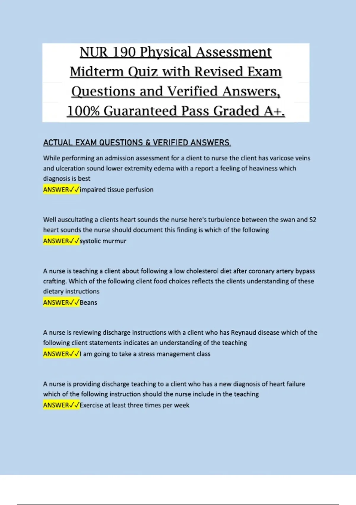 This document provides the complete and updated version of the NUR 190: Physical Assessment Midterm Quiz, featuring revised exam questions and verified correct answers. It covers all major physical assessment concepts studied in the first half of the course, including head-to-toe examination techniques, vital signs, cardiovascular and respiratory assessments, and accurate documentation. Designed for comprehensive review and mastery of foundational nursing skills, this resource guarantees a 100% pass rate and A+ achievement.This document provides the complete and updated version of the NUR 190: Physical Assessment Midterm Quiz, featuring revised exam questions and verified correct answers. It covers all major physical assessment concepts studied in the first half of the course, including head-to-toe examination techniques, vital signs, cardiovascular and respiratory assessments, and accurate documentation. Designed for comprehensive review and mastery of foundational nursing skills, this resource guarantees a 100% pass rate and A+ achievement.