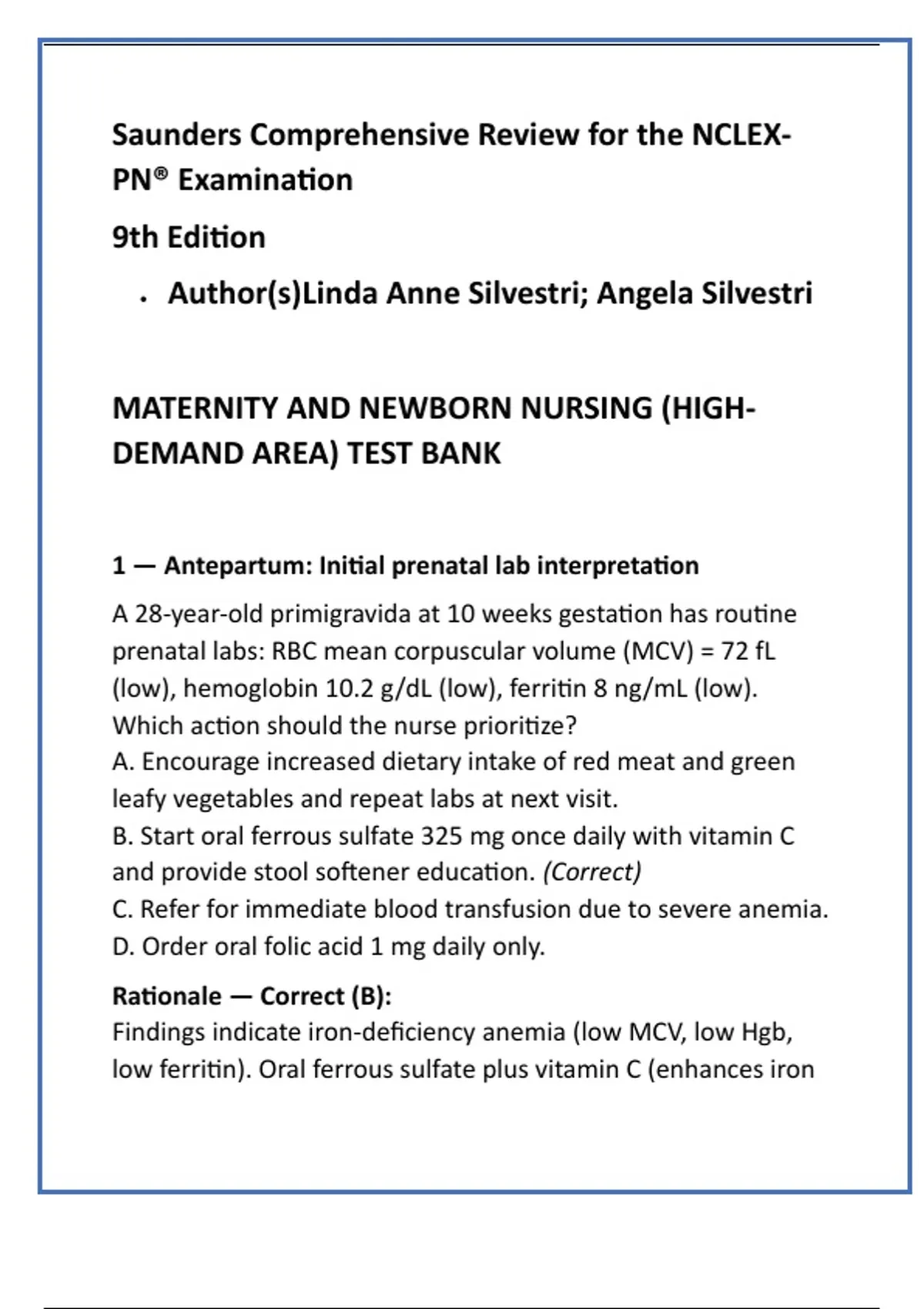 Saunders NCLEX-RN Maternity & Newborn Nursing Test Bank | 2025 Exam Prep | High-Yield Questions, Rationales & Fetal Monitoring Review Meta Description (150–180 characters) Master maternity & newborn nursing for the 2025 NCLEX-RN! High-yield test bank with detailed rationales, fetal heart monitoring, and postpartum care review. Long-Form Product Description (400–600 words) Ace the NCLEX-RN with Confidence — Master Maternity & Newborn Nursing the Smart Way. Prepare smarter and score higher with this original NCLEX-RN–style maternity and newborn nursing test bank, expertly aligned with the 2025 NCLEX-RN Test Plan and based on Saunders Comprehensive Review for the NCLEX-RN Examination (latest edition). Designed by experienced nurse educators and NCLEX item writers, this resource delivers realistic, high-difficulty questions that mirror the exact content areas and cognitive levels tested on the Next Generation NCLEX (NGN).