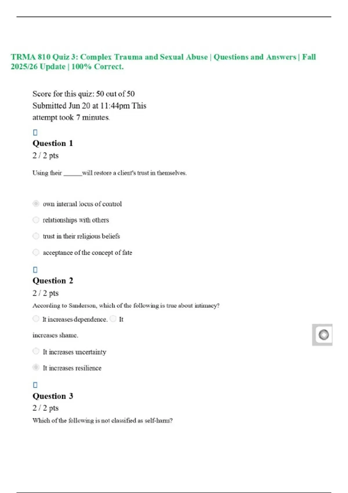 TRMA 810 Quiz 3: Complex Trauma and Sexual Abuse | Questions and Answers | Fall 2025/26 Update | 100% Correct.