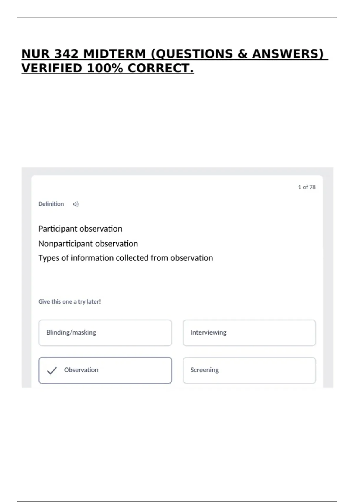NUR 342 MIDTERM (QUESTIONS & ANSWERS) VERIFIED 100% CORRECT.