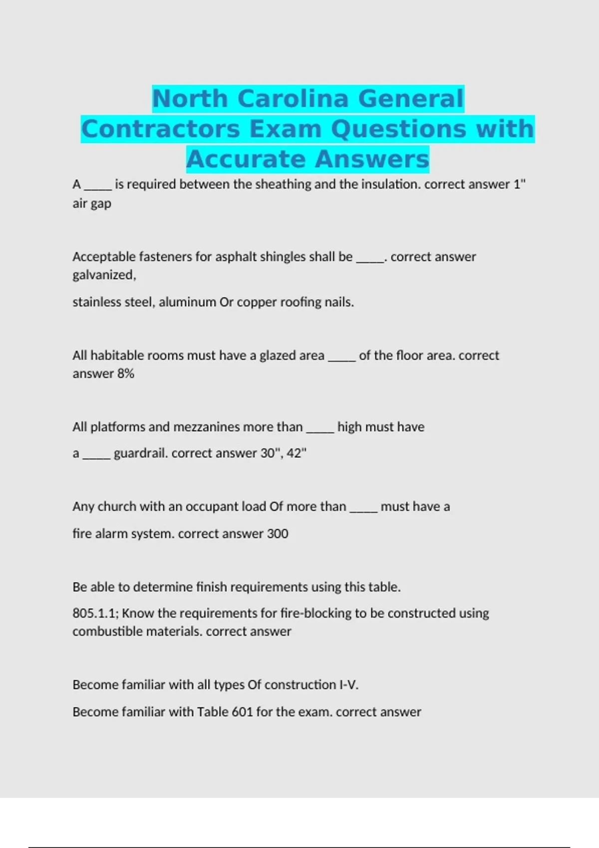 A ____ is required between the sheathing and the insulation. correct answer 1" air gap Acceptable fasteners for asphalt shingles shall be ____. correct answer galvanized, stainless steel, aluminum Or copper roofing nails. All habitable rooms must have a glazed area ____ of the floor area. correct answer 8% All platforms and mezzanines more than ____ high must have a ____ guardrail. correct answer 30", 42" Any church with an occupant load Of more than ____ must have a fire alarm system. correct answer 300 Be able to determine finish requirements using this table. 805.1.1; Know the requirements for fire-blocking to be constructed using combustible materials. correct answer Become familiar with all types Of construction I-V. Become familiar with Table 601 for the exam. correct answer