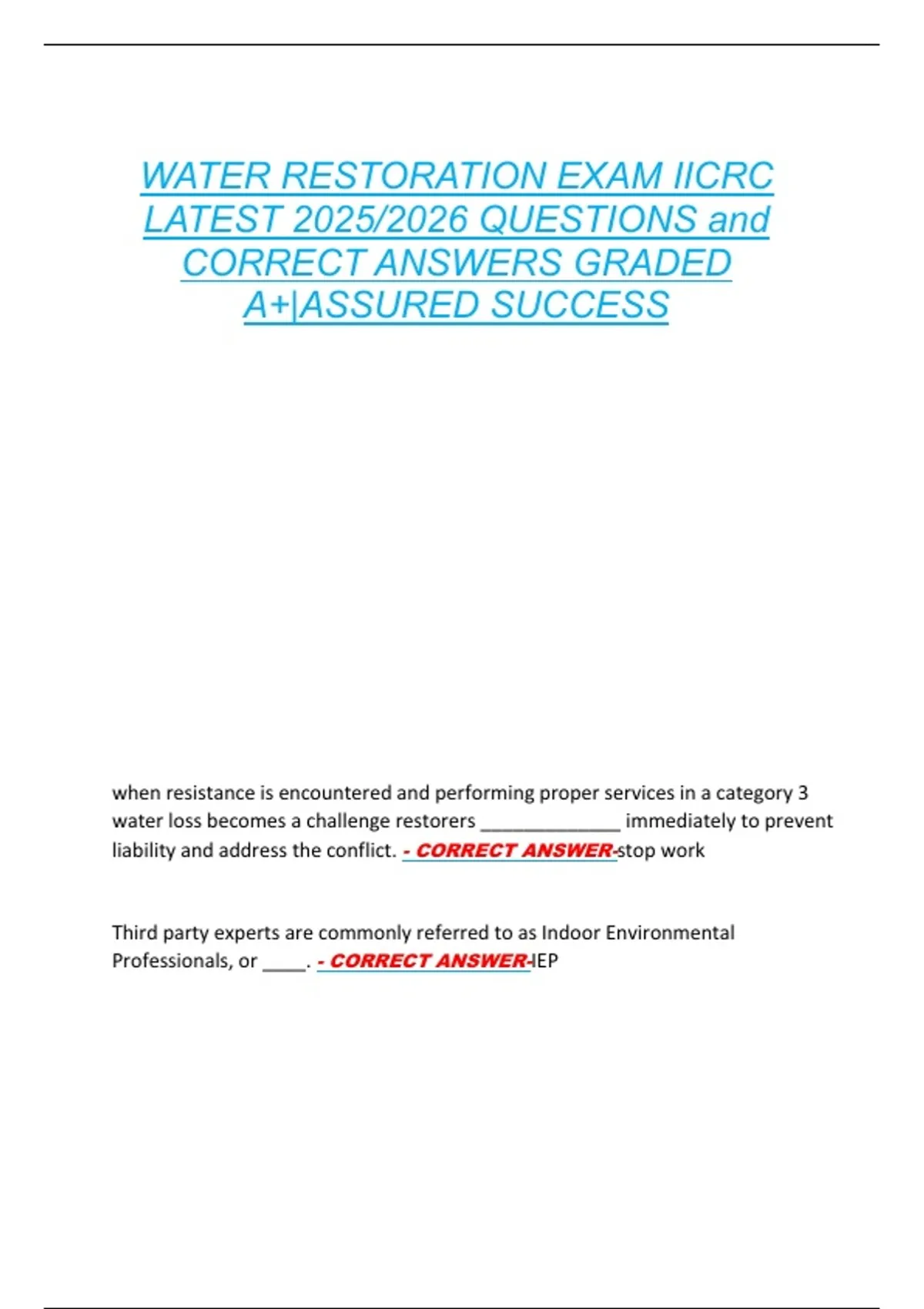 WATER RESTORATION EXAM IICRC LATEST 2025/2026 QUESTIONS and CORRECT ANSWERS GRADED A+|ASSURED SUCCESS