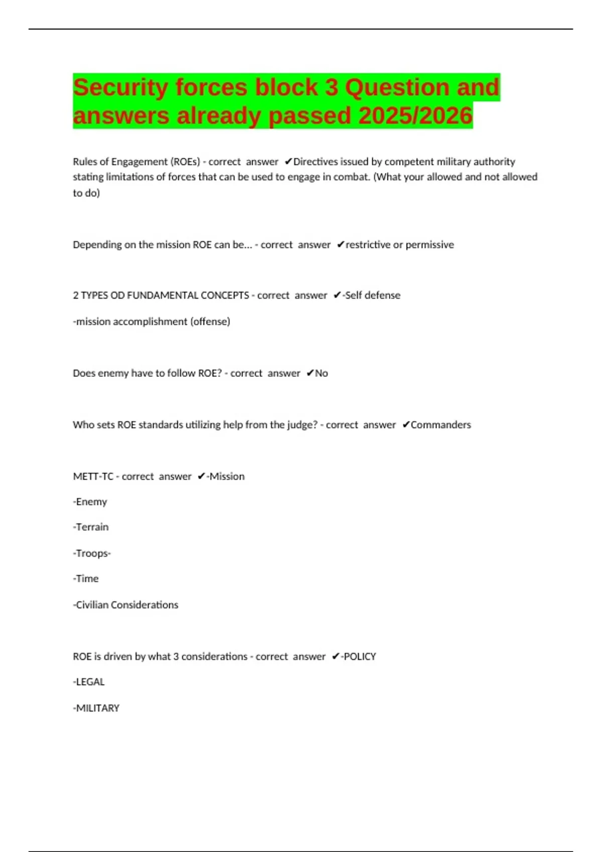Security forces block 3 Question and answers already passed 2025/2026 Rules of Engagement (ROEs) - correct answer Directives issued by competent military authority stating limitations of forces that can be used to engage in combat. (What your allowed and not allowed to do) Depending on the mission ROE can be... - correct answer restrictive or permissive 2 TYPES OD FUNDAMENTAL CONCEPTS - correct answer -Self defense -mission accomplishment (offense) Does enemy have to follow ROE? - correct answer No Who sets ROE standards utilizing help from the judge? - correct answer Commanders METT-TC - correct answer -Mission -Enemy -Terrain -Troops- -Time -Civilian Considerations ROE is driven by what 3 considerations - correct answer -POLICY -LEGAL