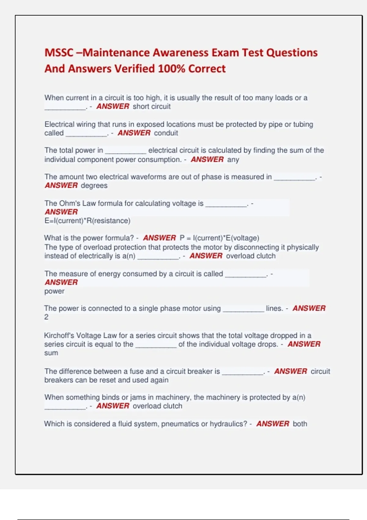 What is the power formula? - ANSWER P = I(current)*E(voltage)