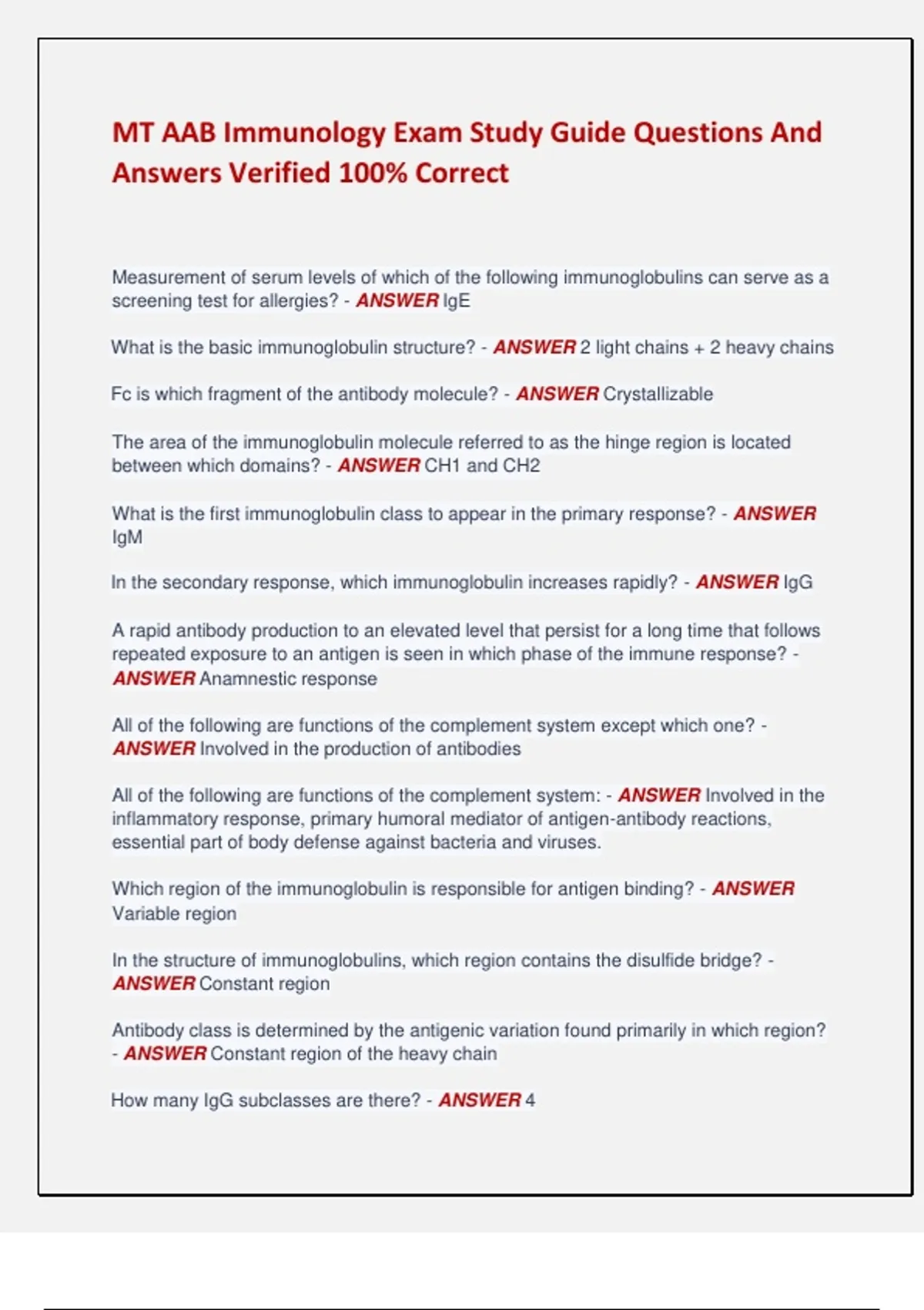 MT AAB Immunology Exam Study Guide Questions And Answers Verified 100% Correct
