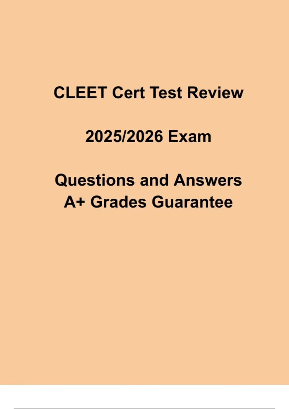 Ace your CLEET Certification Exam with this expert-verified 2025/2026 Test Review Guide, tailored for Oklahoma law enforcement candidates. This study pack includes realistic practice questions and accurate answers covering key CLEET exam areas—criminal law, use of force, ethics, patrol procedures, and report writing. Designed for efficient, focused studying, it helps future officers master core concepts and pass the CLEET test on the first attempt with confidence.
