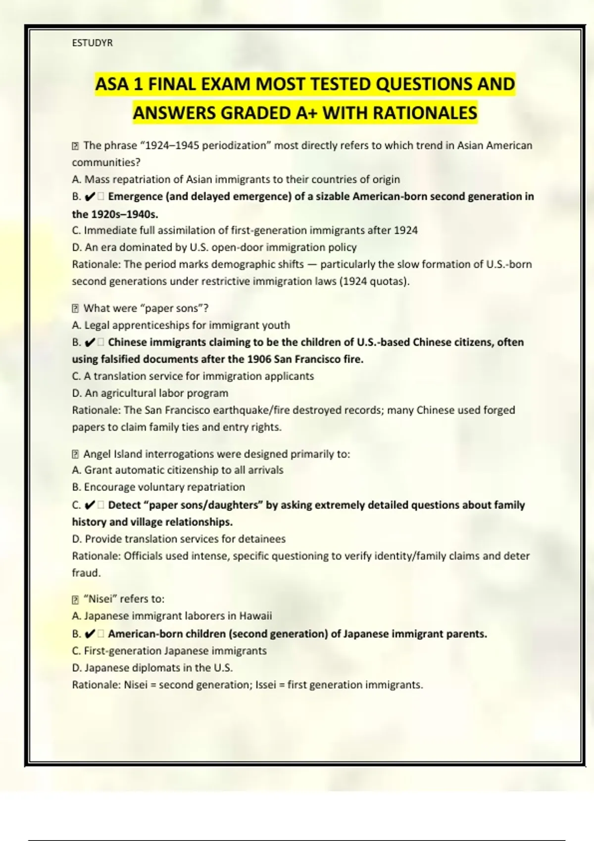 ASA 1 FINAL EXAM MOST TESTED QUESTIONS AND ANSWERS GRADED A+ WITH RATIONALES