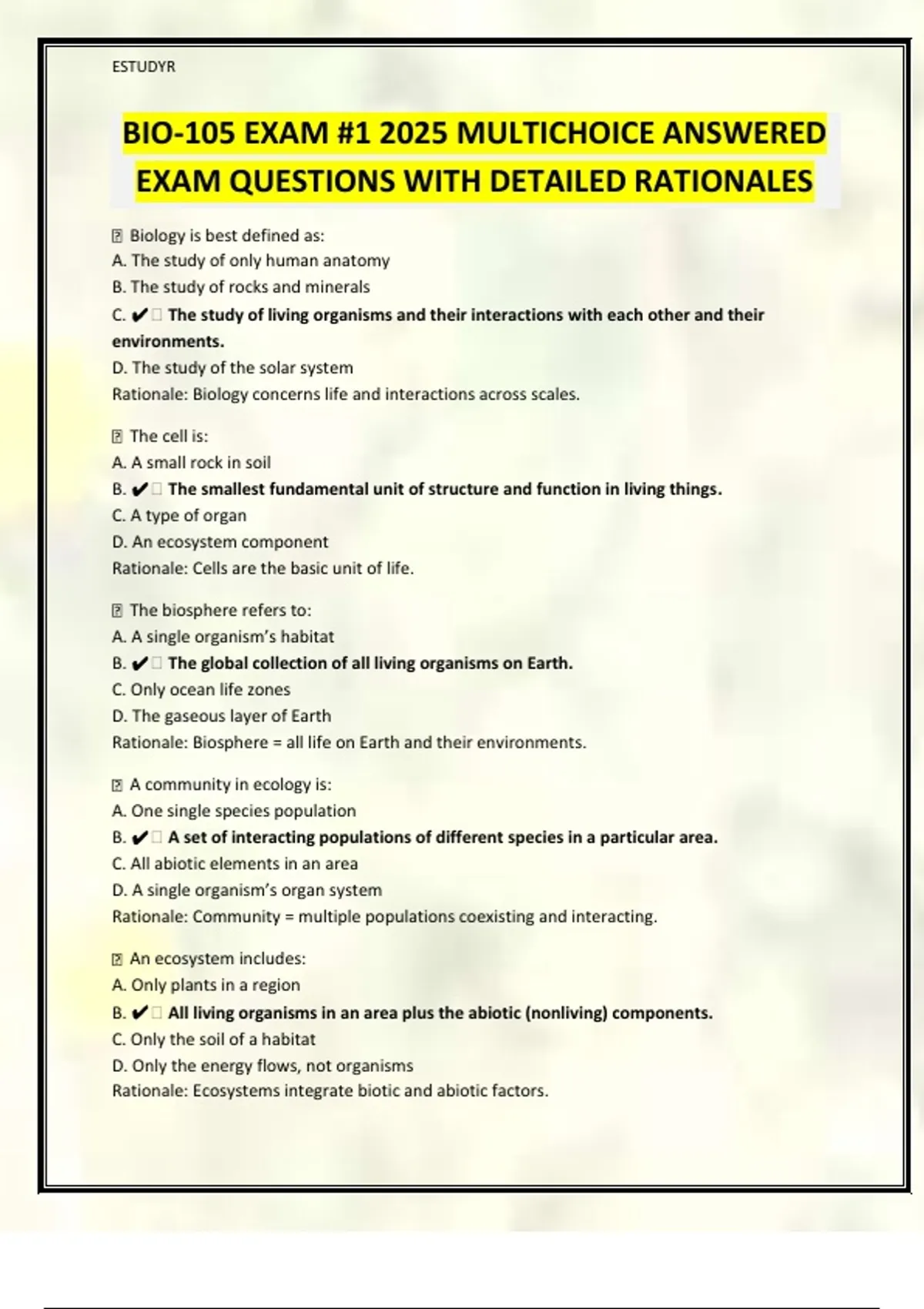 BIO-105 EXAM #1 2025 MULTICHOICE ANSWERED EXAM QUESTIONS WITH DETAILED RATIONALES