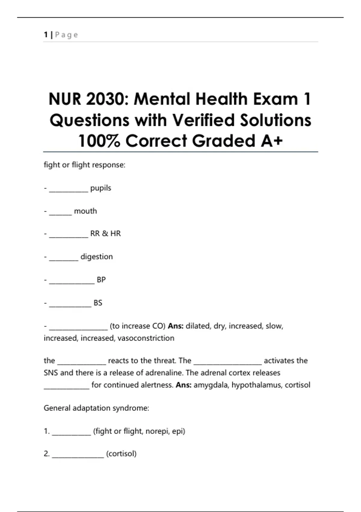NUR 2030: Mental Health Exam 1 Questions with Verified Solutions 100% Correct Graded A+
