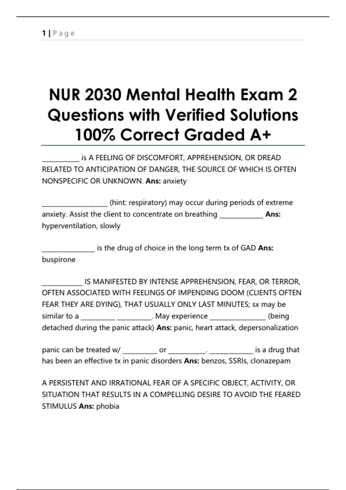 NUR 2030 Mental Health Exam 2 Questions with Verified Solutions 100% Correct Graded A+