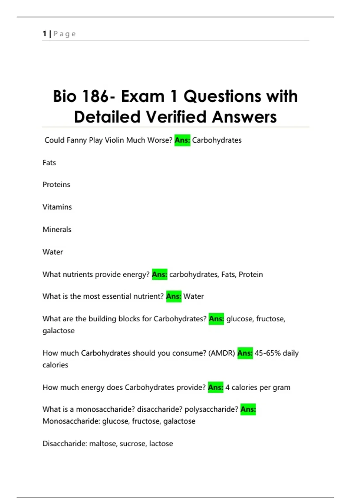 Bio 186- Exam 1 Questions with Detailed Verified Answers