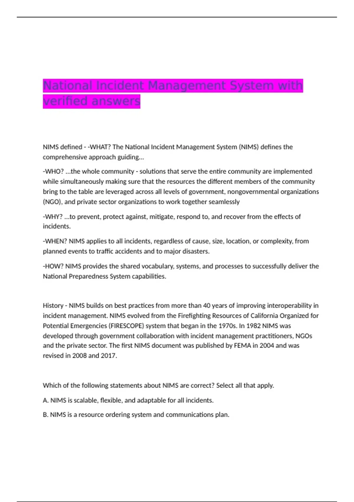 NIMS defined - -WHAT? The National Incident Management System (NIMS) defines the