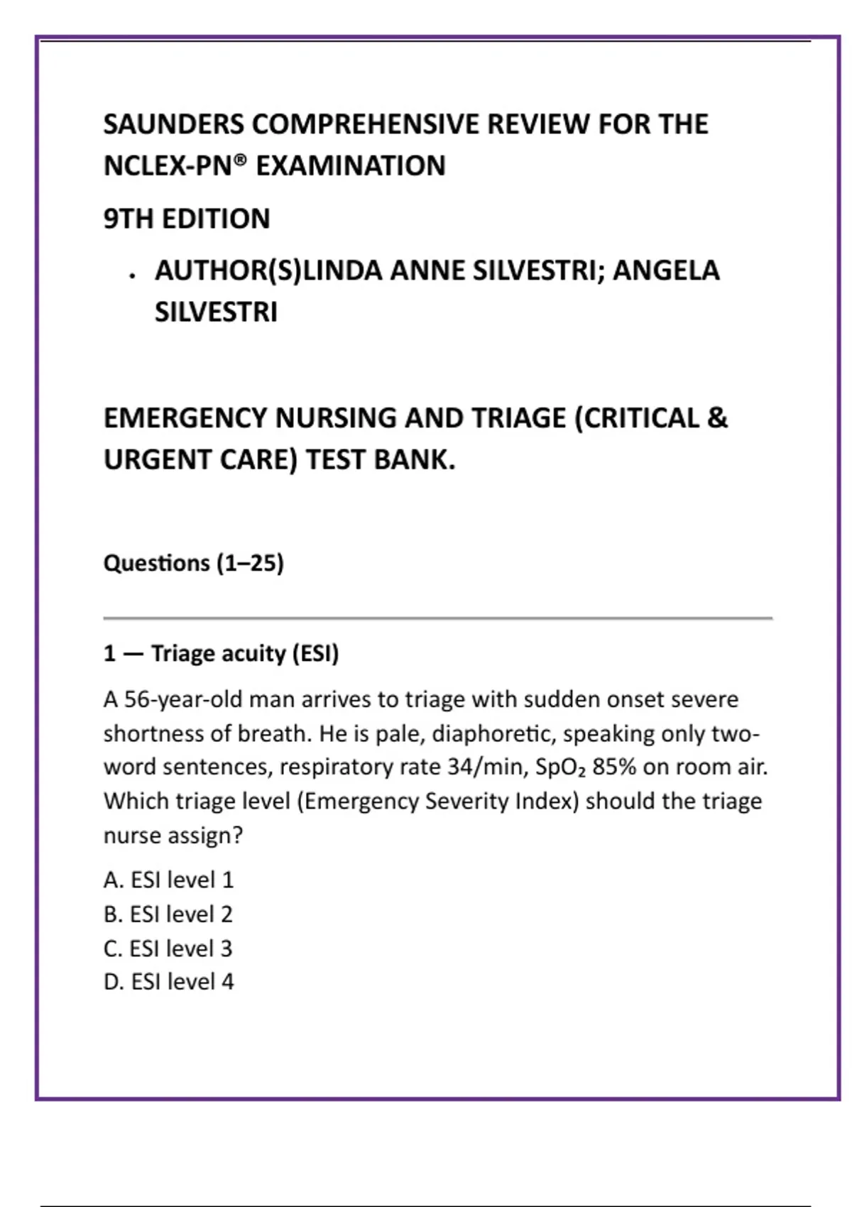 Saunders NCLEX-RN Emergency Nursing & Triage Test Bank | NGN-Style Questions + Rationales | Ace 2025 Exam Confidence! Meta Description (150–160 characters) Master emergency nursing & triage with NGN-style NCLEX-RN test bank based on Saunders Review—detailed rationales, 2025 exam-ready success! Targeted SEO Keywords (10–12) NCLEX-RN Test Bank, Saunders Review, NCLEX 2025, Nursing Exam Prep, Emergency Nursing Questions, Triage Practice Tests, Critical Care NCLEX, Nursing Educator Resource, Fundamentals of Nursing, Next Generation NCLEX, Clinical Judgment Model, NGN Case Studies Hashtags (10) #NCLEXRN #SaundersReview #NursingStudents #NurseEducator #NGN #EmergencyNursing #TriageTraining #NCLEXPrep #NursingSuccess #CriticalCareRN