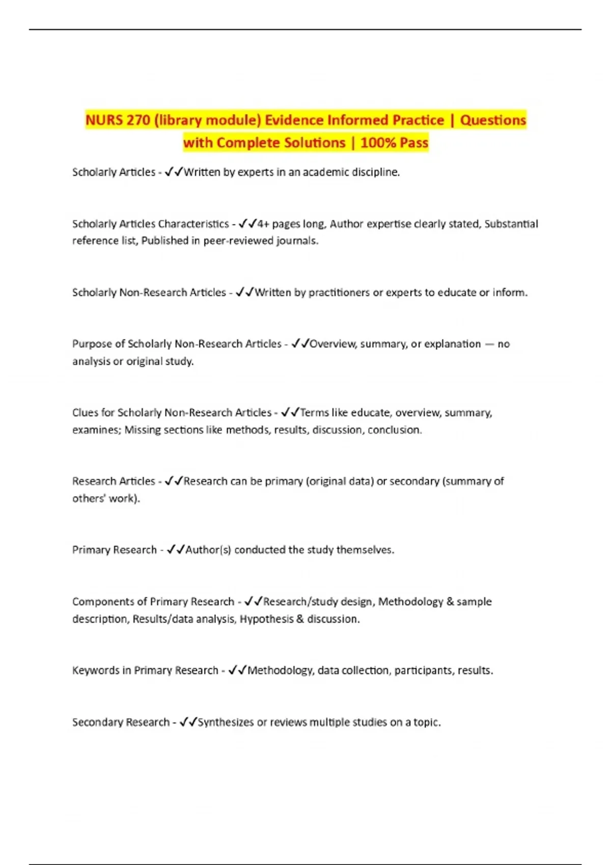 NURS 270 (library module) Evidence Informed Practice | Questions with Complete Solutions | 100% Pass