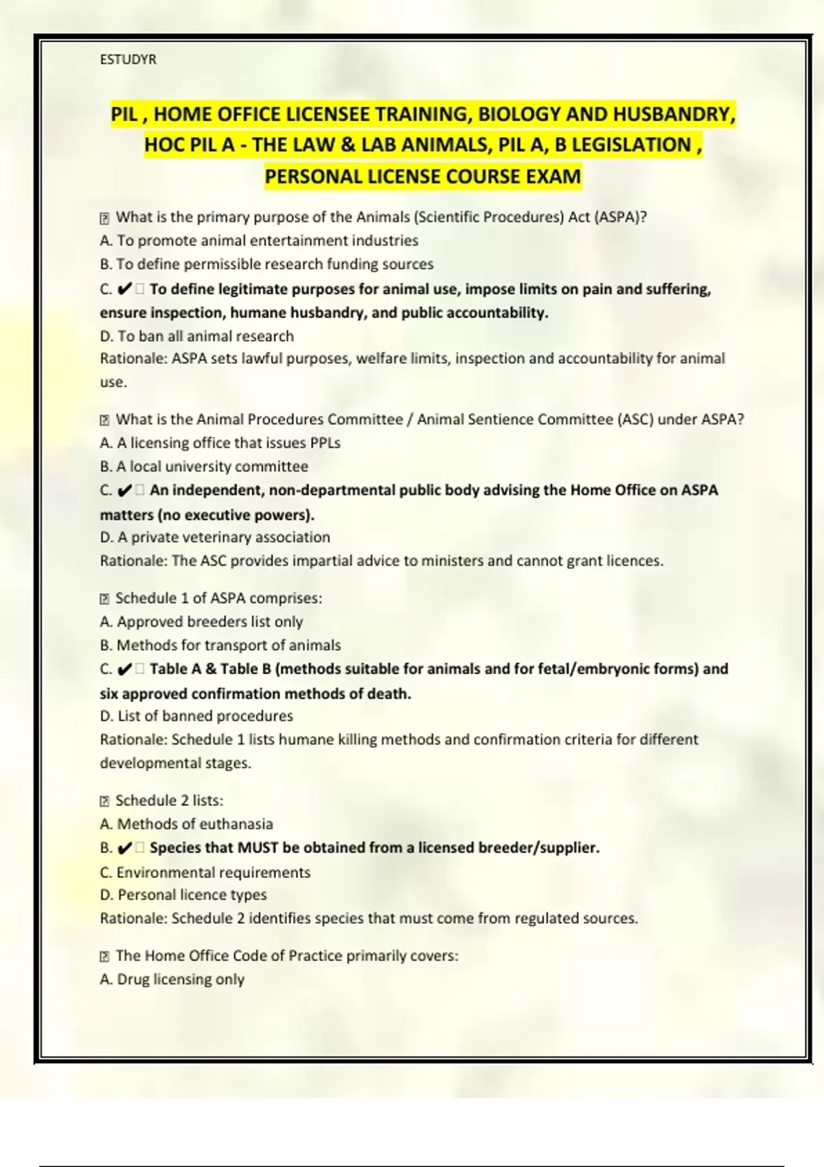 PIL , HOME OFFICE LICENSEE TRAINING, BIOLOGY AND HUSBANDRY, HOC PIL A - THE LAW & LAB ANIMALS, PIL A, B LEGISLATION , PERSONAL LICENSE COURSE EXAM