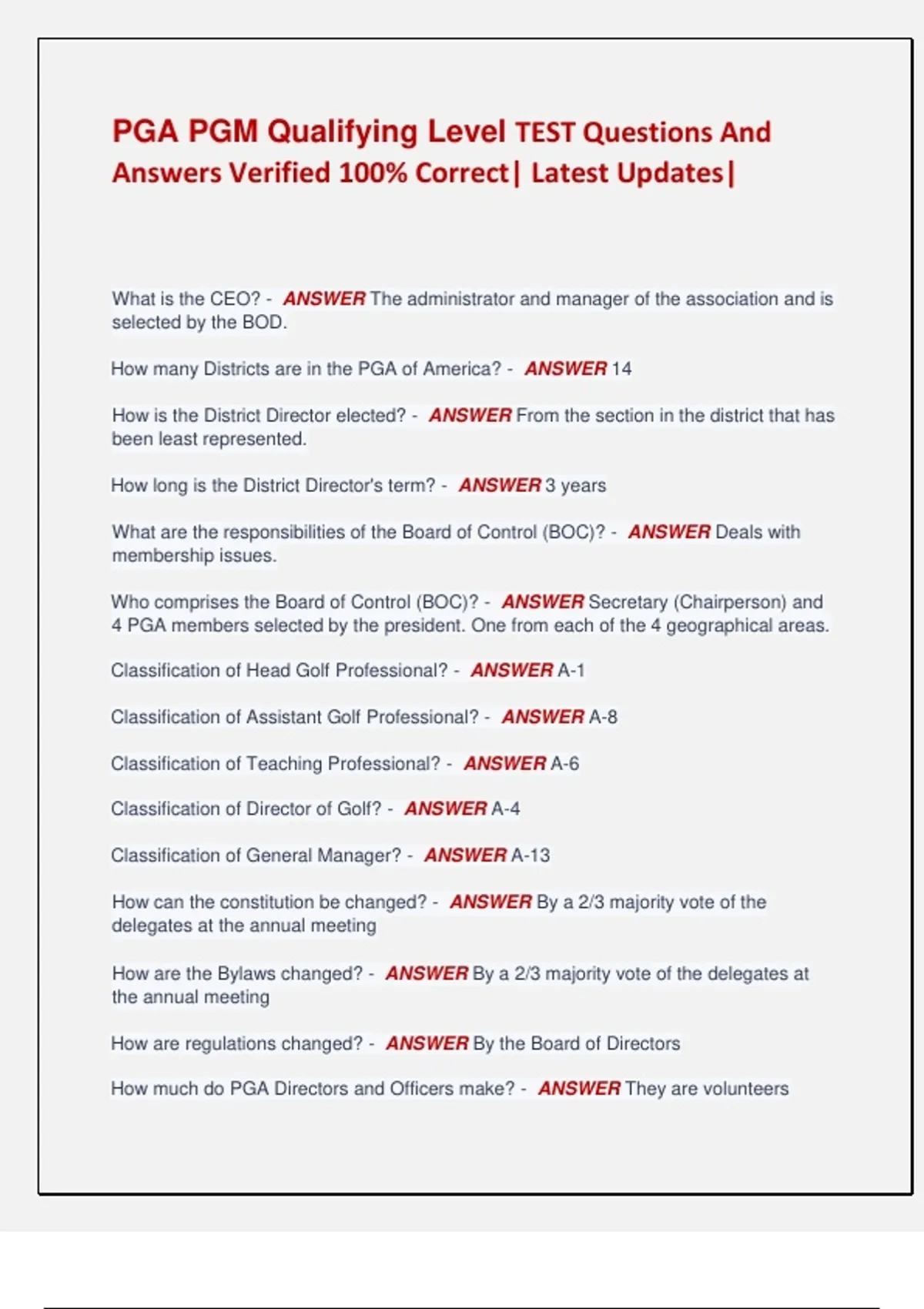 PGA PGM Qualifying Level TEST Questions And Answers Verified 100% Correct| Latest Updates| What is the CEO? - ANSWER The administrator and manager of the association and is selected by the BOD. How many Districts are in the PGA of America? - ANSWER 14 How is the District Director elected? - ANSWER From the section in the district that has been least represented. How long is the District Director's term? - ANSWER 3 years What are the responsibilities of the Board of Control (BOC)? - ANSWER Deals with membership issues. Who comprises the Board of Control (BOC)? - ANSWER Secretary (Chairperson) and 4 PGA members selected by the president. One from each of the 4 geographical areas. Classification of Head Golf Professional? - ANSWER A-1 Classification of Assistant Golf Professional? - ANSWER A-8 Classification of Teaching Professional? - ANSWER A-6 Classification of Director of Golf? - ANSWER A-4 Classification of General Manager? - ANSWER A-13 How can the constitution be changed? - ANSWER By a 2/3 majority vote of the delegates at the annual meeting How are the Bylaws changed? - ANSWER By a 2/3 majority vote of the delegates at the annual meeting How are regulations changed? - ANSWER By the Board of Directors How much do PGA Directors and Officers make? - ANSWER They are volunteers What is a PGA Recognized golf course? - ANSWER A golf facility that has at least 9 holes. Each hole has a minimum yardage of 60 yards and a total 9 hole yardage of not less than 1,000 yards and a total 18 hole yardage of not less than 1,500 yards. The golf facility shall have no less than 14 acres in total course area and be planted entirely of grass (excluding artificial tee mats) What is a PGA Recognized golf range? - ANSWER Must have a minimum of 15 tees. Total distance of 150 feet wide and 600 feet long. Must have at least one parking space per tee. A professional shall be available for private or group instruction. What is an Apprentice? - ANSWER Someone registered in the PGA PGM Program What are the 3 governing bodies that have significant roles in enforcing the Code of Ethics? - ANSWER Section Board of Inquiry, Board of Control, PGA Board of Directors What does the Section Board of Inquiry do with regards to Code of Ethics violations? - ANSWER They investigate complaints of ethics violations within their geographic areas and submit a report of findings to the Board of Control. What does the Board of Control do with regards to Code of Ethics violations? - ANSWER Initiates the review process and investigates alleged Code of Ethics infractions involving PGA of America national tournaments and other national programs. Also reviews cases, either original complaints or appeals, submitted by the Section Boards of Inquiry What does the Board of Directors do with regards to Code of Ethics violations? - ANSWER It hears appeals of Board of Control decisions. The Board of Directors' decisions in such appeals are final. The first Articles of Golf, or set of Rules, was written when? - ANSWER 1744 The USGA and R&A issued a uniform set of rules in what year? - ANSWER 1952 The Rules were substantially reorganized in what year? - ANSWER 1984 Where was the game of golf established? - ANSWER Edinburgh's Brunsfield Links (of six holes). What year was the game of golf established? - ANSWER 1450 When was the USGA created? - ANSWER December 22, 1894. Who was the USGA first president? - ANSWER Theodore Havemeyer Where is the USGA headquarters? - ANSWER Far Hills, N.J. How often are the Rules and Definitions of golf revised? - ANSWER Every 4 years. How often are the Appendices of the Rules and Definitions revised? - ANSWER Every 2 years. Describe the process of how rules are changed? - ANSWER 1. Questions/submission 2. USGA rules committee 3. Joint Rules committee 4. Quadrennial rules committee 5. USGA Executive committee 6. Effective Jan. 1, Every Four Years Why do Rules change? - ANSWER 1. Conditions of play 2. Golf equipment 3. Commercialization 4. The quest for equity There were no rules governing clubs until? - ANSWER 1908. There were no rules governing golf balls until? - ANSWER 1921. In 1990, the USGA and R&A agreed on ball-size restrictions of what weight max and diameter minimum? - ANSWER 1.62 ounces and 1.68-inches When did the USGA limit the maximum number of clubs to 14? - ANSWER 1938 When did the Royal & Ancient Golf Club of St. Andrews publish the "Regulations for the Game of Golf" ? - ANSWER 1893 When did the Royal & Ancient Golf Club of St. Andrews agree to become the world governing authority for the rules of golf? - ANSWER 1897 The first Rules in the US were published when? - ANSWER 1893 When did the USGA and R&A unify as governing bodies for rules? - ANSWER 1951 What date did Rodman Wanamaker gather prominent golfers and professional golfers at a luncheon in New York? - ANSWER January 17, 1916 The official founding of the PGA of America - ANSWER April 10, 1916
