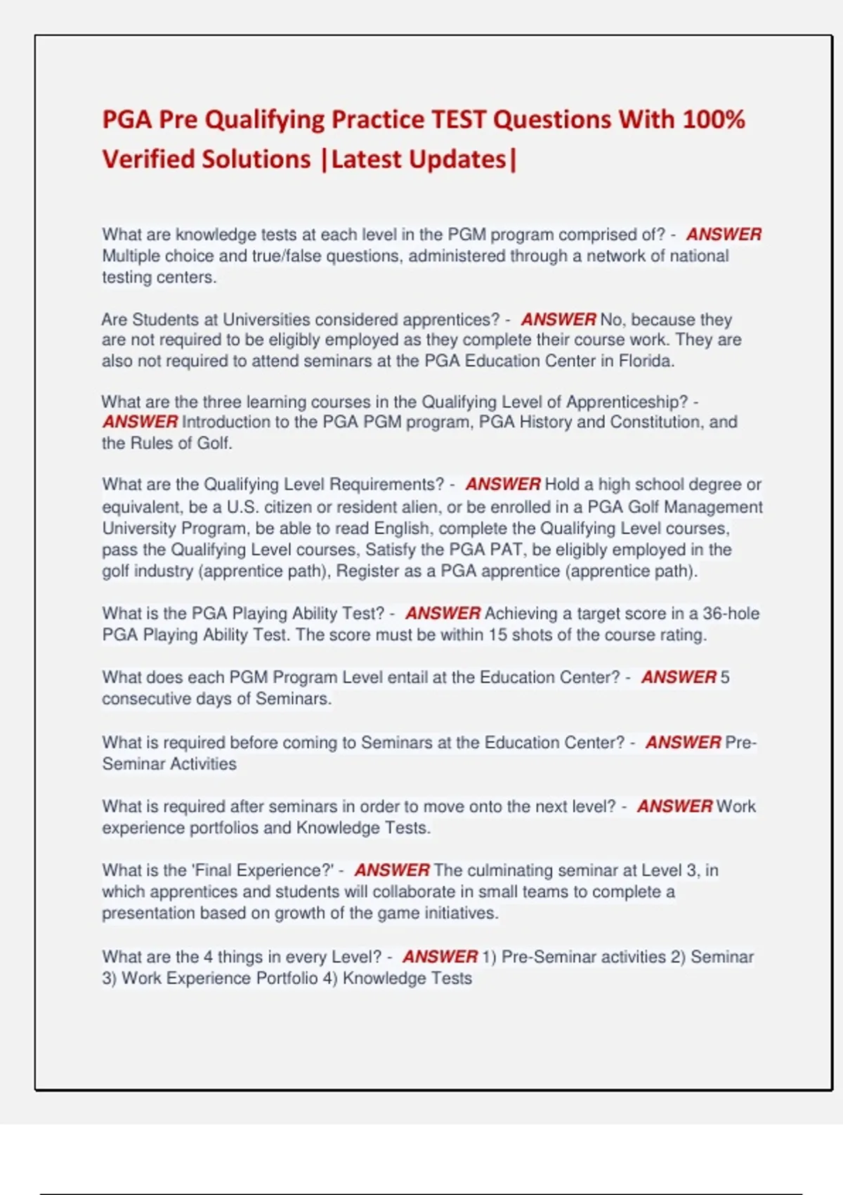 PGA Pre Qualifying Practice TEST Questions With 100% Verified Solutions |Latest Updates| What are knowledge tests at each level in the PGM program comprised of? - ANSWER Multiple choice and true/false questions, administered through a network of national testing centers. Are Students at Universities considered apprentices? - ANSWER No, because they are not required to be eligibly employed as they complete their course work. They are also not required to attend seminars at the PGA Education Center in Florida. What are the three learning courses in the Qualifying Level of Apprenticeship? - ANSWER Introduction to the PGA PGM program, PGA History and Constitution, and the Rules of Golf. What are the Qualifying Level Requirements? - ANSWER Hold a high school degree or equivalent, be a U.S. citizen or resident alien, or be enrolled in a PGA Golf Management University Program, be able to read English, complete the Qualifying Level courses, pass the Qualifying Level courses, Satisfy the PGA PAT, be eligibly employed in the golf industry (apprentice path), Register as a PGA apprentice (apprentice path). What is the PGA Playing Ability Test? - ANSWER Achieving a target score in a 36-hole PGA Playing Ability Test. The score must be within 15 shots of the course rating. What does each PGM Program Level entail at the Education Center? - ANSWER 5 consecutive days of Seminars. What is required before coming to Seminars at the Education Center? - ANSWER Pre- Seminar Activities What is required after seminars in order to move onto the next level? - ANSWER Work experience portfolios and Knowledge Tests. What is the 'Final Experience?' - ANSWER The culminating seminar at Level 3, in which apprentices and students will collaborate in small teams to complete a presentation based on growth of the game initiatives. What are the 4 things in every Level? - ANSWER 1) Pre-Seminar activities 2) Seminar 3) Work Experience Portfolio 4) Knowledge Tests What is the acceptable progress policy on Level 1? - ANSWER Must be completed within 2 years of Level 1 start date. What is the acceptable progress policy on Level 2? - ANSWER Must be completed within 2 years of Level 2 start date. What is the acceptable progress policy on Level 3? - ANSWER Must be completed within 8 years of Level 1 start date. What happens to Apprentices who do not make acceptable progress in the program? - ANSWER Suspension or termination from the program. What happens if an Apprentice is not elected within 8 years of the Level 1 start date? - ANSWER Termination from the program in its entirety. Including passing the PAT. What are the 5 fees apprentices will face in basic costs of the PGM Program? - ANSWER 1) Online course access for each level 2) PGA Playing Ability Test Registration fees 3) Apprentice Registration fees and association dues 4) Seminar Attendance fees 5) Computer-based testing fees What are the Level 1 courses? - ANSWER 1) Golf car fleet management 2) Customer relations 3) Introduction to teaching and golf club performance 4) Business planning 5) Tournament operations What are the Level 2 courses? - ANSWER 1) Turfgrass management 2) Golf operations 3) Intermediate teaching and golf club alteration 4) Merchandising and Inventory Management What are the Level 3 courses? - ANSWER 1) Food and beverage control 2) Human resource management and supervising and delegating 3) Advanced teaching and golf club fitting 4) Player development programs and teaching business 5) Career enhancement What are the 3 big assessments? - ANSWER 1) Work experience portfolio (every level) 2) Knowledge Tests (every level) 3) The Final Experience (Final level) What is the definition of a work experience portfolio? - ANSWER Activities that allow apprentices and students to apply what they learn in a course to on-the-job situations and tasks. This ensures that the course learning outcomes translate into practical, workrelated skills. Can also be presented to potential employers as a record of an applicant's skills and experience. Will be submitted for evaluation. What are the four criteria that will be used to evaluate a work portfolio? - ANSWER 1) Presentation 2) Problem solving skills 3) Communication 4) Use of tools, techniques, and procedures How many courses total are there in the PGM Level 1-3? - ANSWER 14 courses Approximately how many hours of work experience activities will an apprentice need to schedule, complete, and document? - ANSWER 250 hours. What things are suggested when making an action plan? - ANSWER 1) Use a calendar 2) View the big picture 3) Break it down 4) Establish benchmarks 5) Use checklists 6) Be flexible, but disciplined 7) Get help 8) Set up a reward system What is the definition of a Supervising Professional? - ANSWER A PGA member who has committed to providing support and advice to an apprentice or student in the program. What is Internship? - ANSWER 16 months of practical training in the golf industry required of all PGA Golf Management University Program students prior to graduation. All must be completed following the eligible employment guidelines outlined in the PGA Constitution, Bylaws and Regulations. What is a Level? - ANSWER One of three groupings of courses, work experiences, and knowledge tests that must be completed to advance in the program. What is Membership Services? - ANSWER The department of the PGA that guides apprentices, students, and members throughout their PGA careers- From Prior to and Initial registration in the PGA Professional Golf Management Program to Life Member classification. The services provided include registration for the Playing Ability Tests, tracking the employment histories of each member and apprentice, monitoring educational qualifications and professional credits, and maintaining correct registration for tournaments and correct classifications as prescribed by the PGA Constitution. What is PGA.org? - ANSWER The PGA member, apprentice, and PGA Golf Management University student website of t