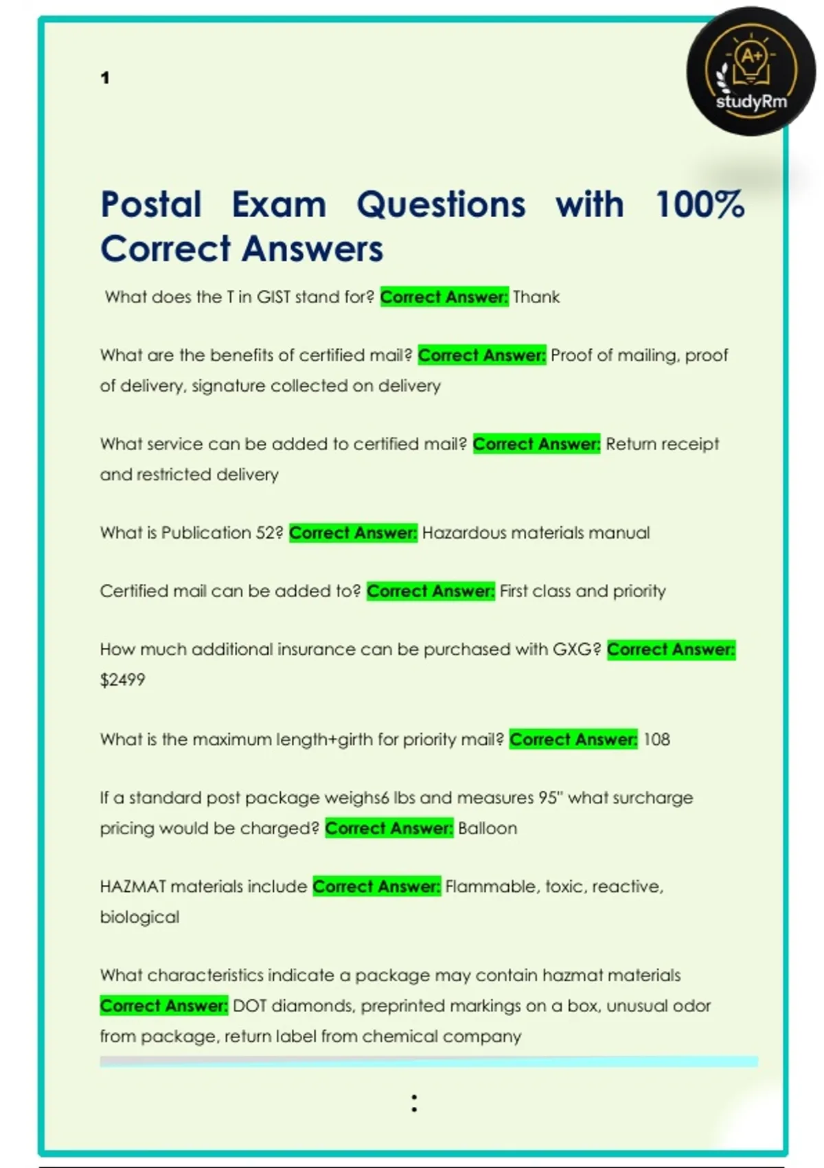 Postal Exam Questions with 100%
