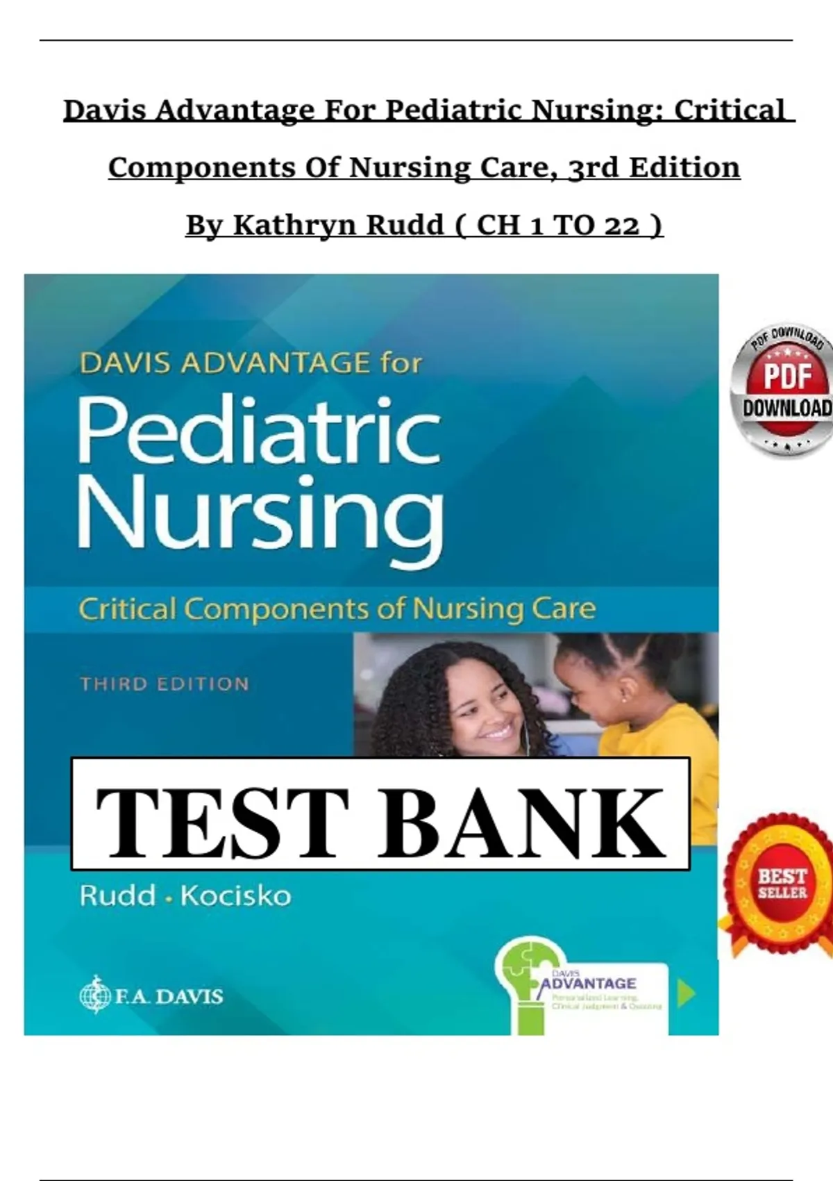 Davis Advantage for Pediatric Nursing: Critical Components of Nursing Care, 3rd Edition by Kathryn Rudd, provides a comprehensive, evidence-based guide to pediatric nursing. Covering chapters 1–22, this resource emphasizes child growth and development, health promotion, disease prevention, acute and chronic illness management, family-centered care, pediatric assessment, pharmacology, patient safety, clinical decision-making, and interprofessional collaboration. Ideal for nursing students, NCLEX preparation, pediatric clinical practice, and professional development. Widely used by nursing schools, pediatric programs, and healthcare educators, available on Stuvia for test banks, study guides, and practice questions.