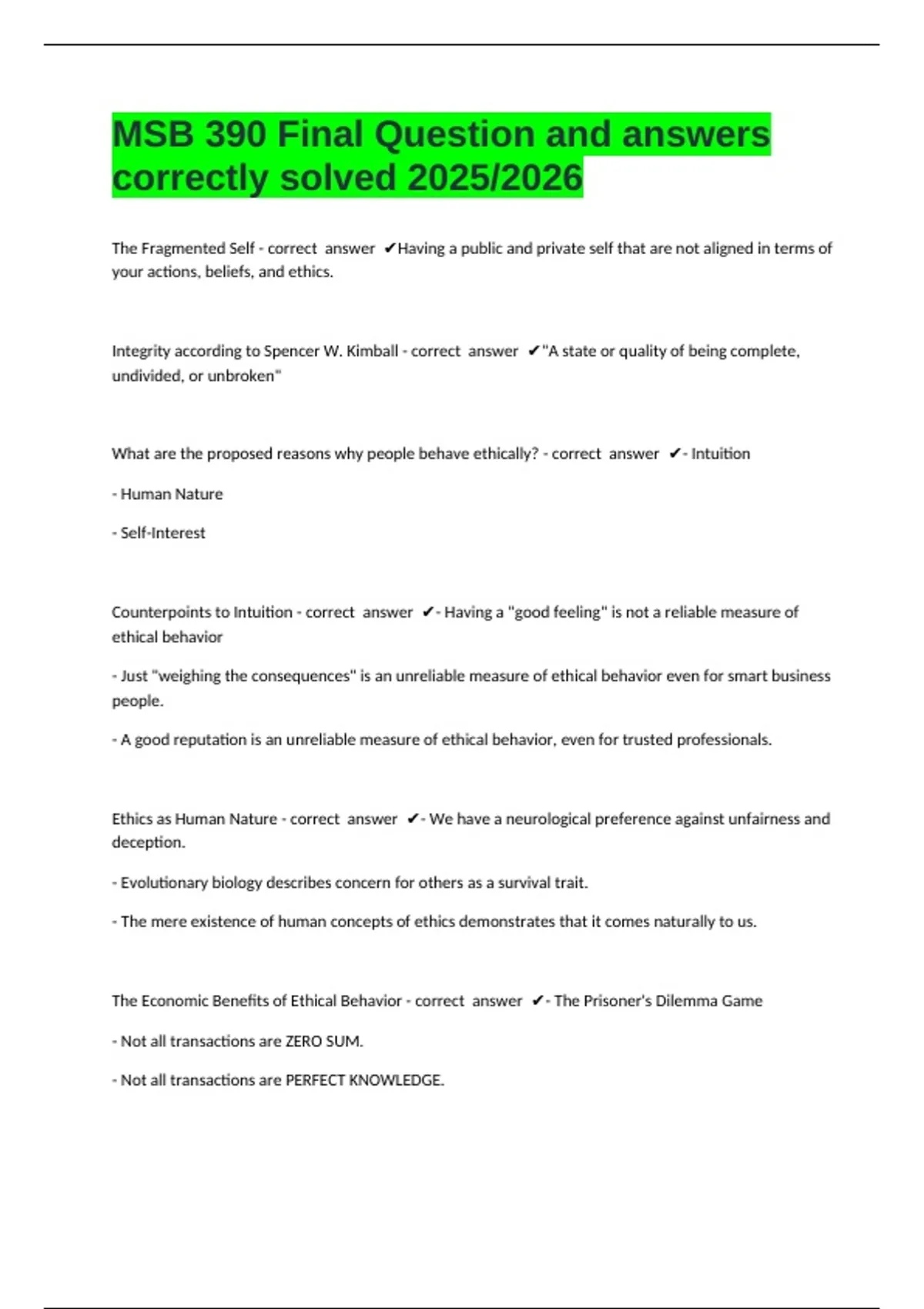 MSB 390 Final Question and answers correctly solved 2025/2026 The Fragmented Self - correct answer Having a public and private self that are not aligned in terms of your actions, beliefs, and ethics. Integrity according to Spencer W. Kimball - correct answer "A state or quality of being complete, undivided, or unbroken" What are the proposed reasons why people behave ethically? - correct answer - Intuition - Human Nature - Self-Interest Counterpoints to Intuition - correct answer - Having a "good feeling" is not a reliable measure of ethical behavior