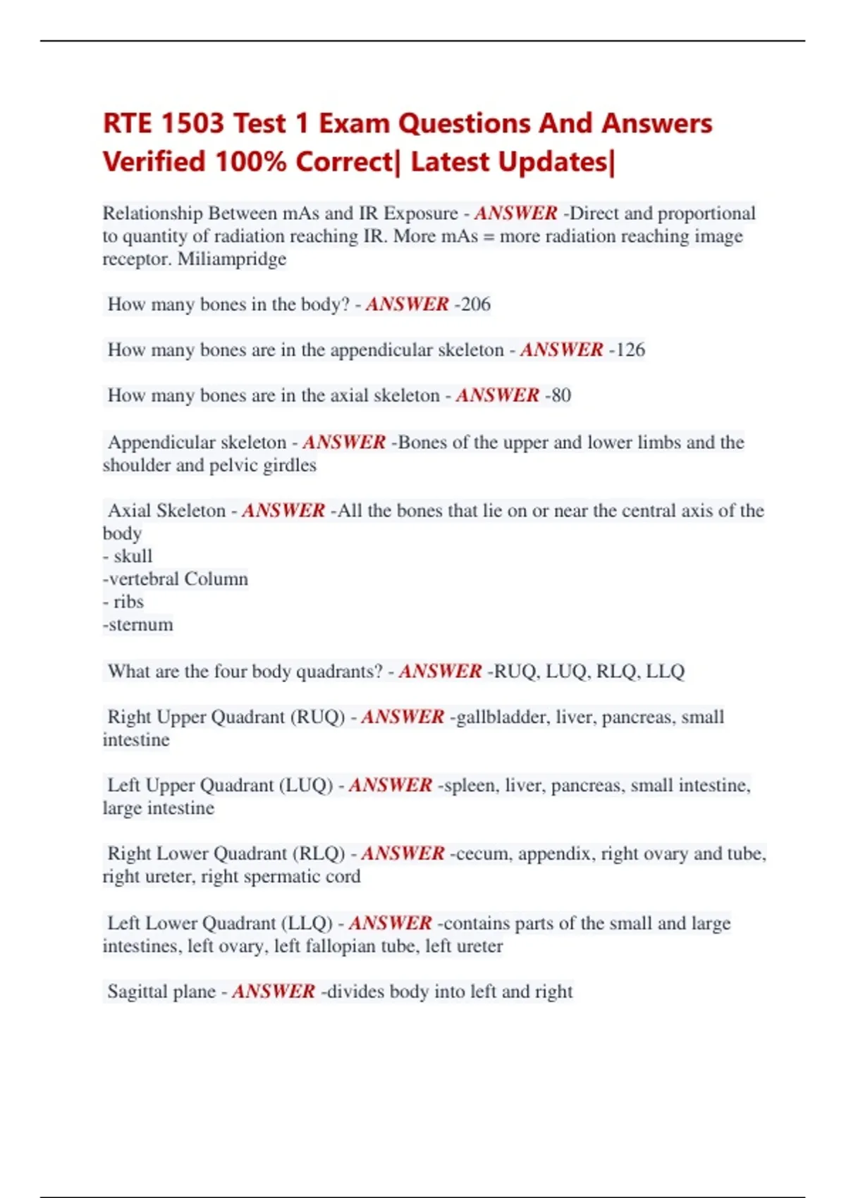 RTE 1503 Test 1 Exam Questions And Answers Verified 100% Correct| Latest Updates| Relationship Between mAs and IR Exposure - ANSWER -Direct and proportional to quantity of radiation reaching IR. More mAs = more radiation reaching image receptor. Miliampridge How many bones in the body? - ANSWER -206 How many bones are in the appendicular skeleton - ANSWER -126 How many bones are in the axial skeleton - ANSWER -80 Appendicular skeleton - ANSWER -Bones of the upper and lower limbs and the shoulder and pelvic girdles Axial Skeleton - ANSWER -All the bones that lie on or near the central axis of the body - skull -vertebral Column - ribs -sternum What are the four body quadrants? - ANSWER -RUQ, LUQ, RLQ, LLQ Right Upper Quadrant (RUQ) - ANSWER -gallbladder, liver, pancreas, small intestine Left Upper Quadrant (LUQ) - ANSWER -spleen, liver, pancreas, small intestine, large intestine Right Lower Quadrant (RLQ) - ANSWER -cecum, appendix, right ovary and tube, right ureter, right spermatic cord Left Lower Quadrant (LLQ) - ANSWER -contains parts of the small and large intestines, left ovary, left fallopian tube, left ureter Sagittal plane - ANSWER -divides body into left and right Coronal Plane - ANSWER -divides body into front(anterior) and back (posterior) Horizontal (axial) plane - ANSWER -dividing the body into superior (top) and inferior (bottom) portions Oblique Plane - ANSWER -At an angle and not parallel to the rest of the planes Midsagittal (median) plane - ANSWER -Divided the body into equal left and right sides Dorsum - ANSWER -top of foot Plantar - ANSWER -sole of foot Dorsal - ANSWER -back of hand Palmar - ANSWER -palm of hand Body Habitus - ANSWER -common variations in the shape of the human body Sthenic - ANSWER -Average body habitus (50%) Hypostenic - ANSWER -slender normal shape 35% population Hyperstenic - ANSWER -big boned body; stocky, 5%, wide short thorax Asthenic - ANSWER -very slender (10%) Xiphoid - ANSWER -Body landmark at T10 Gonion - ANSWER -Body landmark at C3 Thyroid cartilage - ANSWER -Body landmark at C4 Sternal Notch - ANSWER -Body landmark at T2 Sternal Angle - ANSWER -Body landmark at T4 Verterba prominens - ANSWER -Body landmark at C7 Inferior border of the scapula - ANSWER -Body landmark at T7 ALARA - ANSWER -As Low As Reasonably Achievable - meaning to keep all radiation exposure as low as reasonably achievable Distortion - ANSWER -When an image is not the actual size or shape that it truly is Size distortion- affects the size shape distortion- affects the shape Noise - ANSWER -Anything that degrades image on the image receptor PTX - ANSWER -Pneumothorax Free air in the plural space/cavity 2 projections are taken one with inspiration one with expiration PNA - ANSWER -pneumonia Fluid in the lungs Lordotic Position - ANSWER -Depressing shoulders down and rolling arms forward so the scapula with move out of the way for the image medial - ANSWER -toward the midline Lateral - ANSWER -away from the midline Proximal - ANSWER -Closer to the point of attachment Distal - ANSWER -away from the point of attachment Cephalad - ANSWER -toward the head Caudad - ANSWER -toward the tail Interior - ANSWER -inside of something or nearer to the center