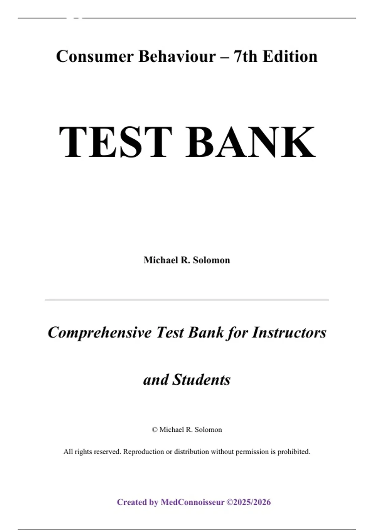 The Test Bank for Consumer Behaviour, 7th Edition by Michael R. Solomon provides a verified and comprehensive collection of instructor-designed questions that align precisely with the official Pearson edition. This test bank includes multiple-choice, true/false, short-answer, and application-based questions tailored to evaluate understanding of consumer psychology, marketplace decision-making, and cultural influences on consumption. Structured around the book’s major sections, it ensures complete coverage of every chapter and concept featured in the textbook. The contents are fully verified from the official Pearson Table of Contents and presented in exact order. Section One – Consumers in the Marketplace introduces the foundations of consumer research in Chapter 1: An Introduction to Consumer Behaviour. Section Two – Consumers as Individuals explores psychological and personal factors that shape behavior through Chapter 2: Perception, Chapter 3: Learning and Memory, Chapter 4: Motivation and Affect, Chapter 5: The Self, and Chapter 6: Personality, Lifestyles, and Values. Section Three – Attitude Change and Decision Making examines how consumers form and adjust opinions and make purchase choices, including Chapter 7: Attitudes, Chapter 8: Attitude Change and Interactive Communications, Chapter 9: Individual Decision Making, and Chapter 10: Buying and Disposing. Finally, Section Four – Consumers in Their Social and Cultural Settings highlights social, familial, and cultural contexts of consumer life in Chapter 11: Group Influence and Social Media, Chapter 12: Income, Social Class, and Family Structure, Chapter 13: Subcultures, Chapter 14: Cultural Influences on Consumer Behaviour, and Chapter 15: The Creation and Diffusion of Culture.