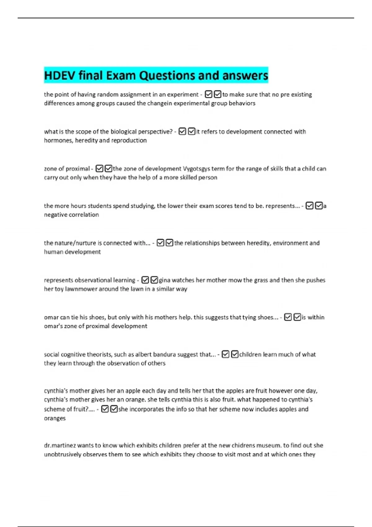 HDEV final Exam Questions and answers the point of having random assignment in an experiment - to make sure that no pre existing differences among groups caused the changein experimental group behaviors what is the scope of the biological perspective? - it refers to development connected with hormones, heredity and reproduction