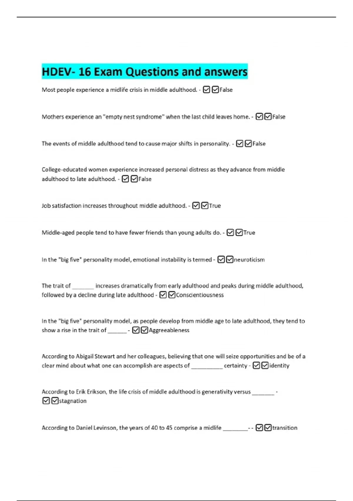 HDEV- 16 Exam Questions and answers Most people experience a midlife crisis in middle adulthood. - False Mothers experience an "empty nest syndrome" when the last child leaves home. - False The events of middle adulthood tend to cause major shifts in personality. - False College-educated women experience increased personal distress as they advance from middle adulthood to late adulthood. - False