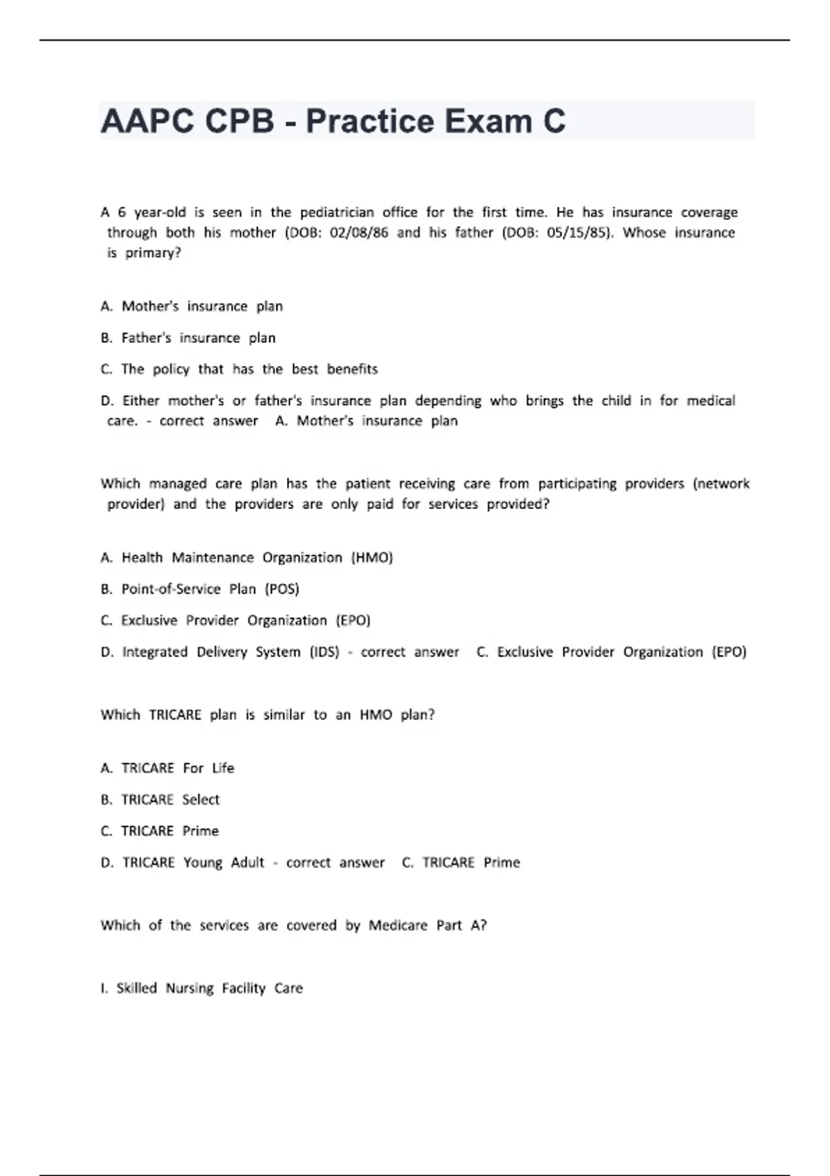 This essential AAPC CPB Practice Exam C provides a comprehensive set of verified questions and accurate answers for the Certified Professional Biller certification. It covers key billing and compliance topics, including the Subscriber Rule/Birthday Rule for primary insurance, types of managed care plans (HMO, EPO, POS), Medicare Parts and covered services (Part A, B, C, D), TRICARE plans, and Workers' Compensation fundamentals. This is a critical resource for students preparing to successfully pass the AAPC CPB examination.
