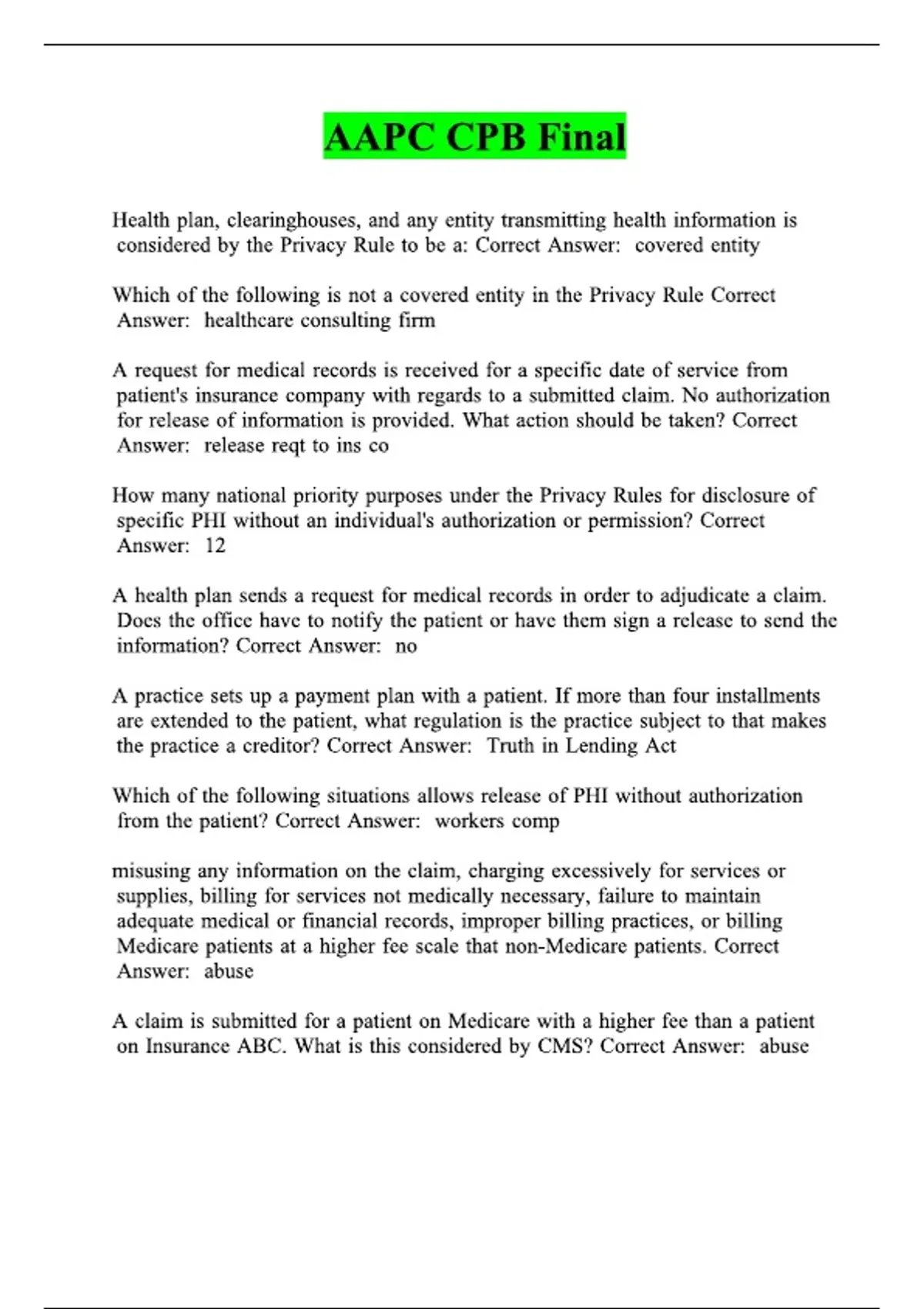 This essential AAPC CPB Final Exam review is a comprehensive study guide for the Certified Professional Biller (CPB) certification, updated for the testing period. It includes verified questions and correct answers covering core billing compliance and regulations, such as HIPAA Privacy Rule (Covered Entities, PHI disclosure), the Truth in Lending Act regarding patient payment plans, and various forms of fraudulent billing practices. This resource is critical for students preparing to successfully pass the AAPC CPB examination