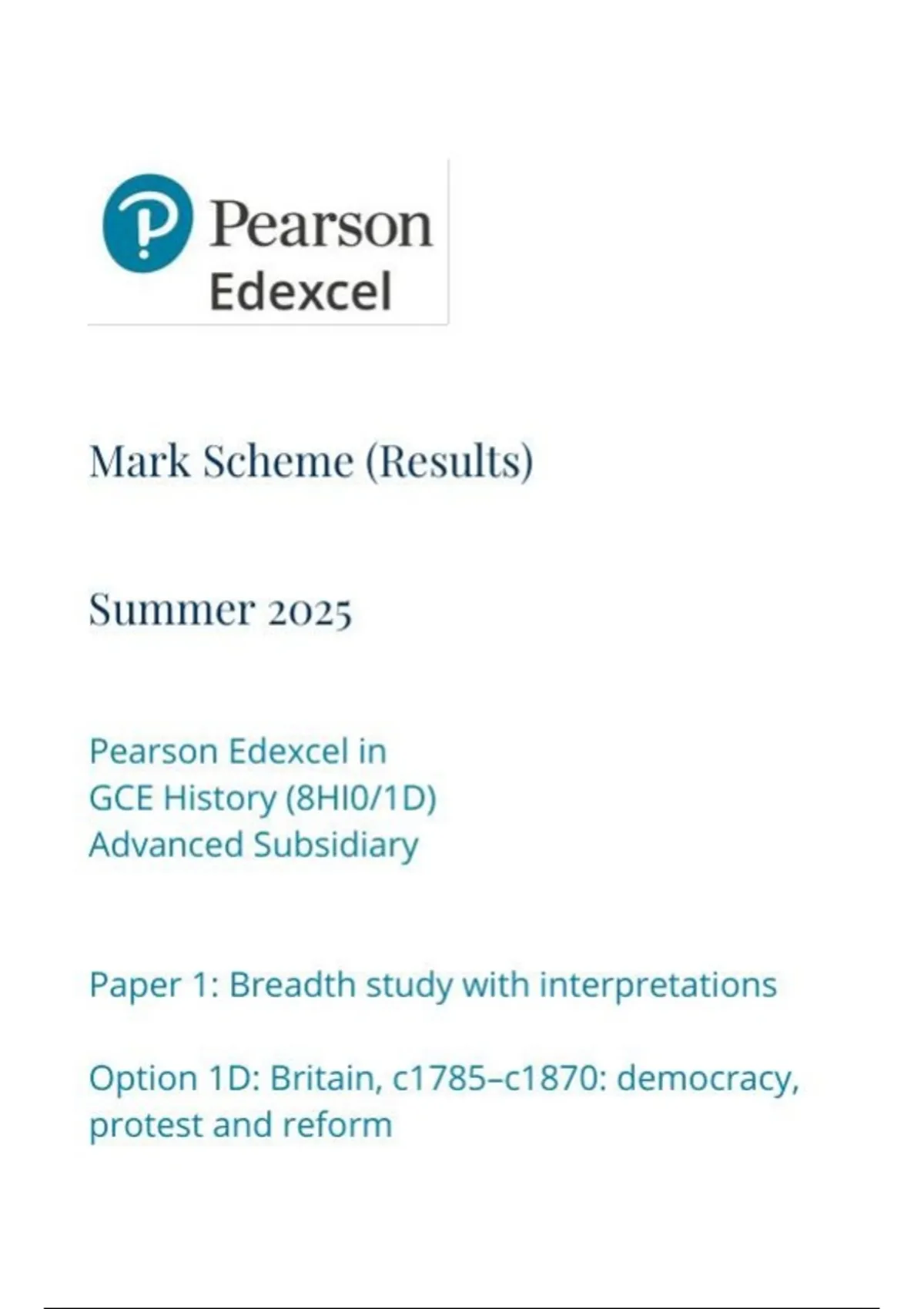 Pearson Edexcel as level History |final mark scheme |2025| 8hi0-1d