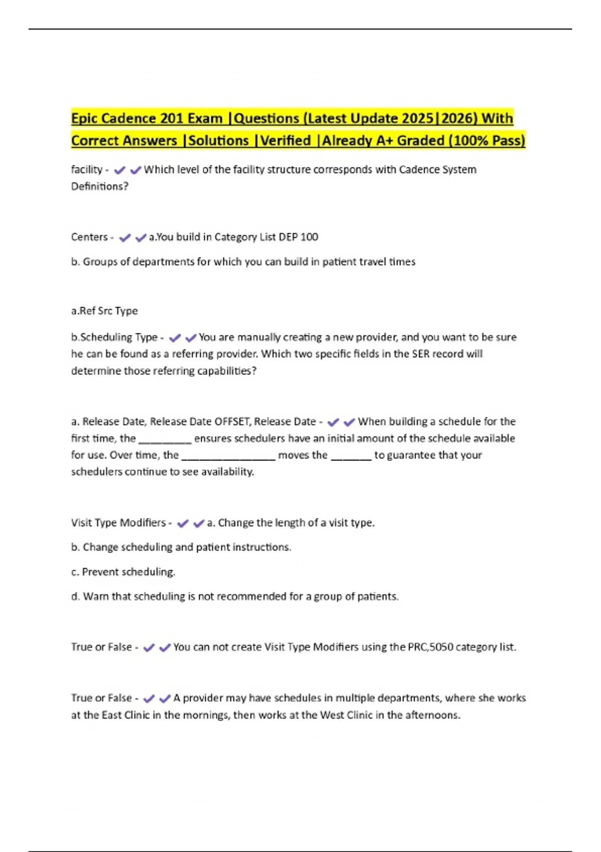 Epic Cadence 201 Exam |Questions (Latest Update 2025|2026) With Correct Answers |Solutions |Verified |Already A+ Graded (100% Pass)