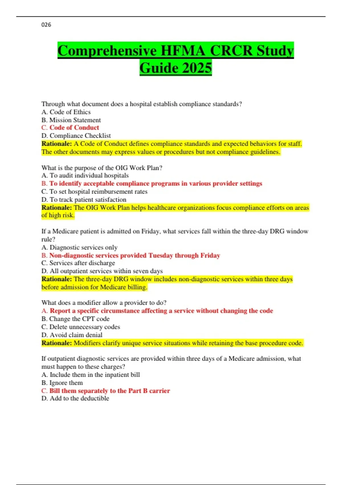 Through what document does a hospital establish compliance standards? A. Code of Ethics B. Mission Statement C. Code of Conduct D. Compliance Checklist Rationale: A Code of Conduct defines compliance standards and expected behaviors for staff. The other documents may express values or procedures but not compliance guidelines. What is the purpose of the OIG Work Plan? A. To audit individual hospitals B. To identify acceptable compliance programs in various provider settings C. To set hospital reimbursement rates D. To track patient satisfaction Rationale: The OIG Work Plan helps healthcare organizations focus compliance efforts on areas of high risk. If a Medicare patient is admitted on Friday, what services fall within the three-day DRG window rule? A. Diagnostic services only B. Non-diagnostic services provided Tuesday through Friday C. Services after discharge D. All outpatient services within seven days Rationale: The three-day DRG window includes non-diagnostic services within three days before admission for Medicare billing. What does a modifier allow a provider to do? A. Report a specific circumstance affecting a service without changing the code B. Change the CPT code C. Delete unnecessary codes D. Avoid claim denial Rationale: Modifiers clarify unique service situations while retaining the base procedure code. If outpatient diagnostic services are provided within three days of a Medicare admission, what must happen to these charges? A. Include them in the inpatient bill B. Ignore them C. Bill them separately to the Part B carrier D. Add to the deductible Rationale: Outpatient diagnostic services within three days must be billed separately under Part B per Medicare rules. What is a recurring or series registration? A. One registration record created for multiple days of service B. A record for each visit C. Emergency patient record D. Discharge note Rationale: This type of registration simplifies patient data management for ongoing or repeated visits. What are nonemergency patients who come for service without prior notification called? A. Walk-ins B. Unscheduled patients C. Admissions D. Outpatients Rationale: “Unscheduled” patients are those arriving without prearranged appointments. Which statement applies to the observation patient type? A. Short-term inpatients B. Used to evaluate the need for inpatient admission C. Outpatients staying less than one hour D. Emergency cases only Rationale: Observation status helps determine if full inpatient care is necessary. Which services must hospice programs provide around the clock? A. Therapy and housekeeping B. Physician, Nursing, and Pharmacy