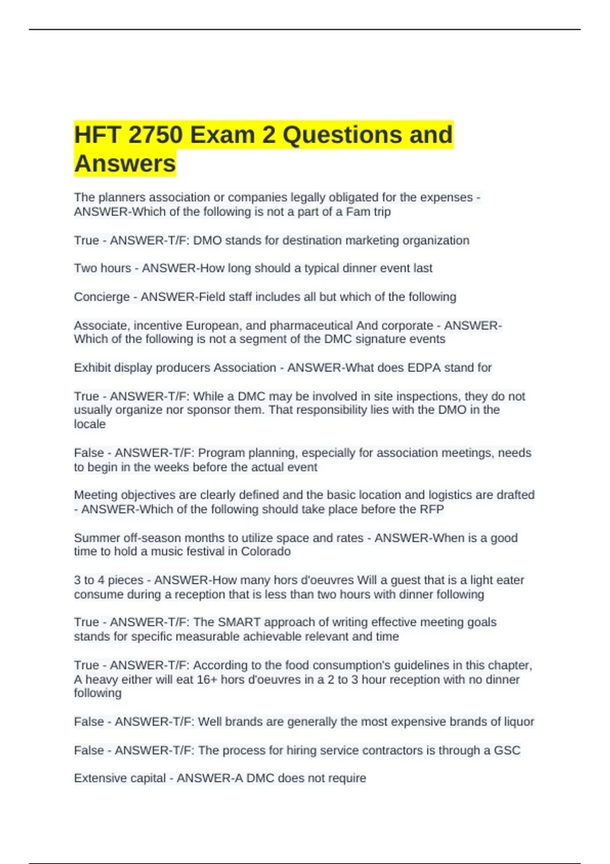 HFT 2750 Exam 2 Questions and Answers