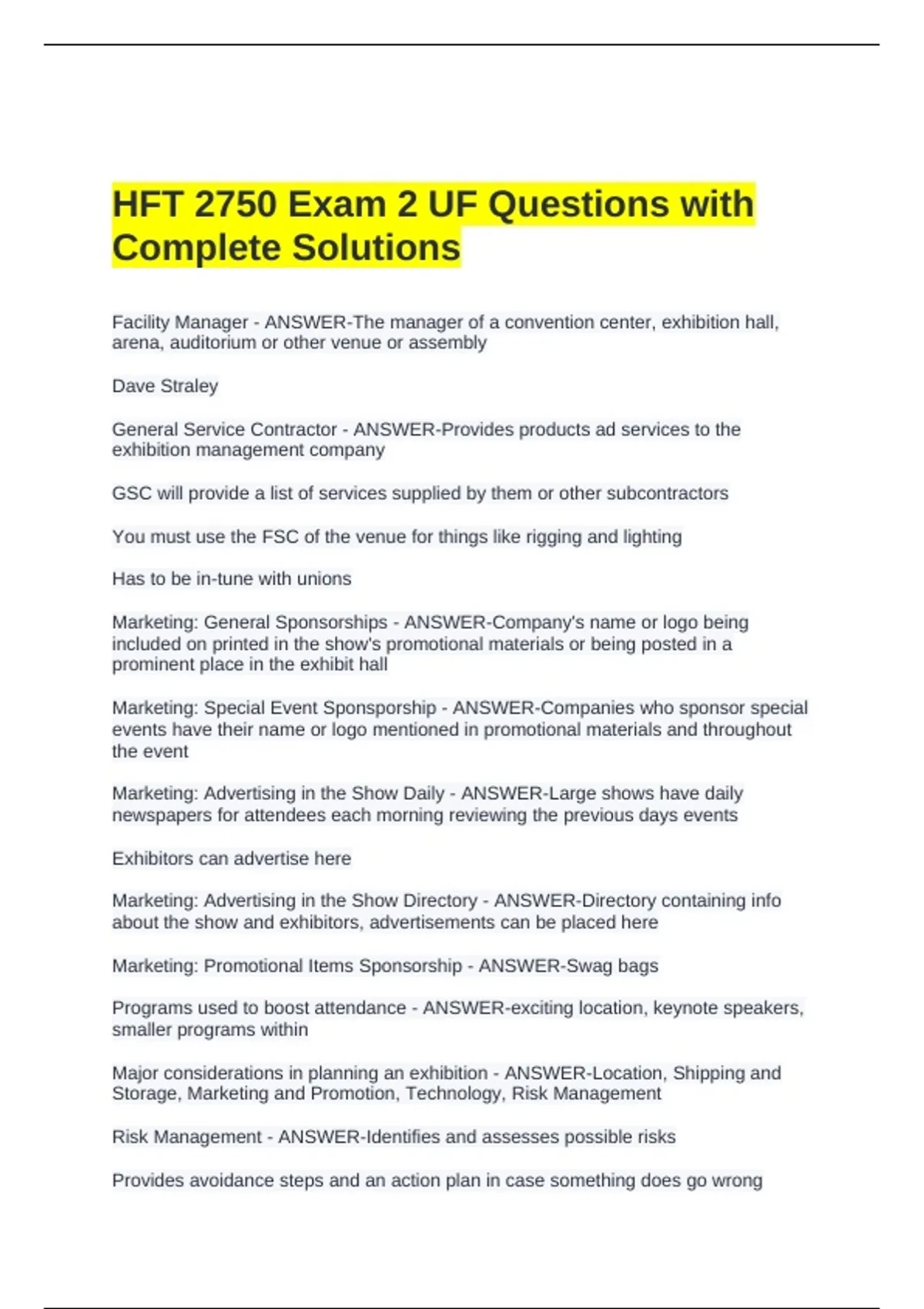 HFT 2750 Exam 2 UF Questions with