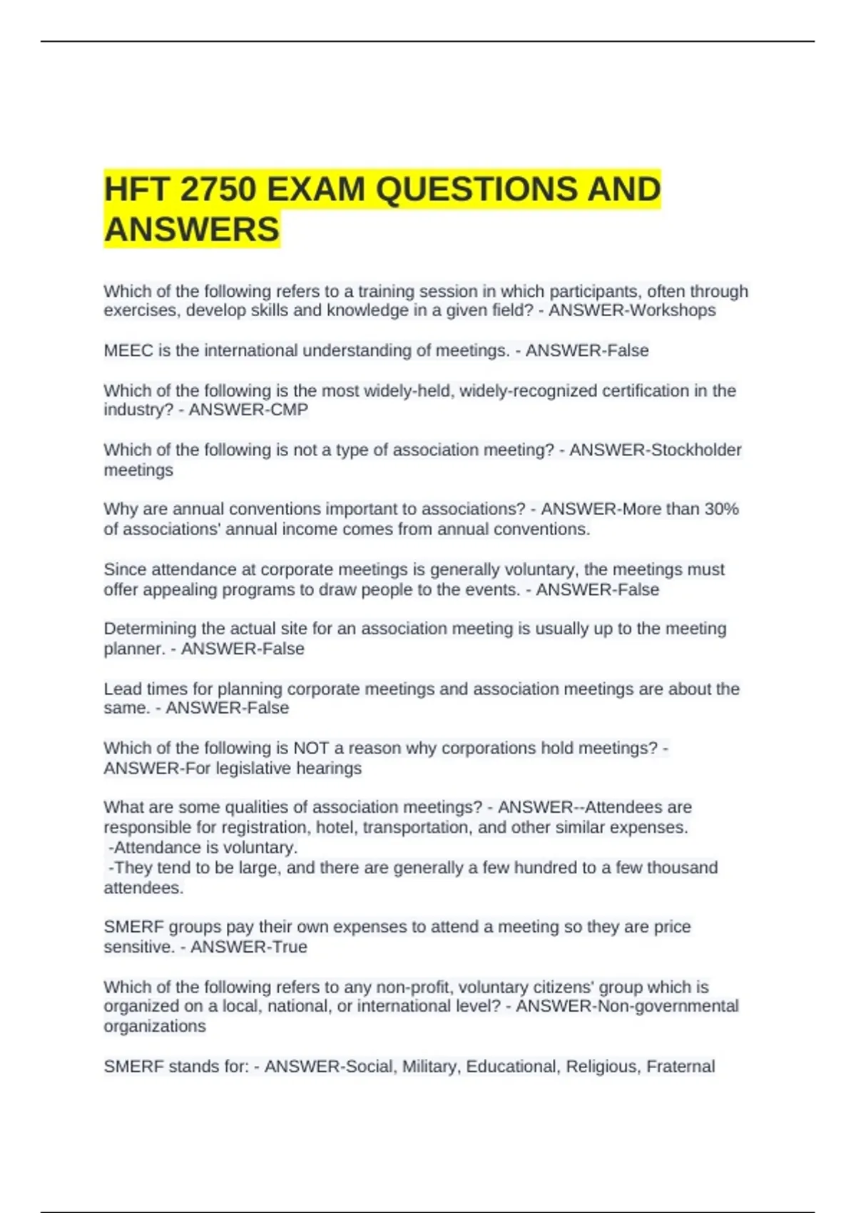 HFT 2750 EXAM QUESTIONS AND
