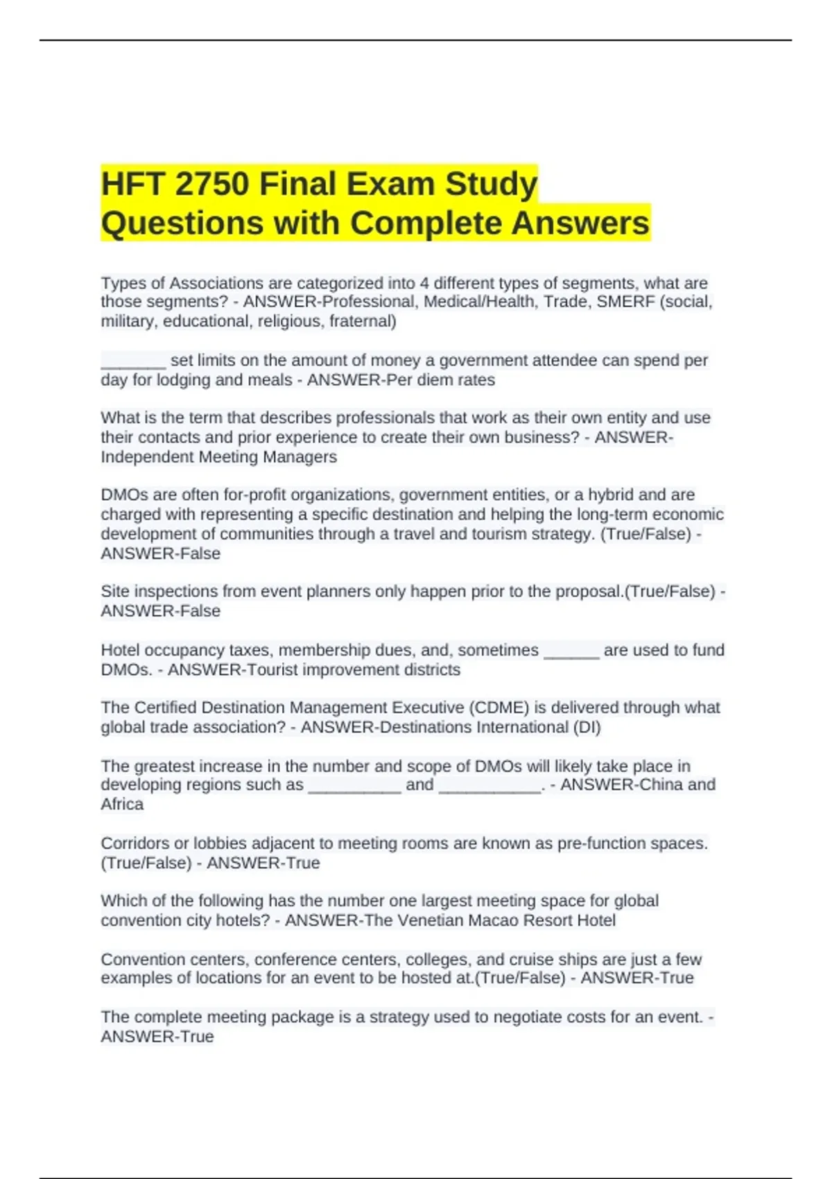 HFT 2750 Final Exam Study Questions with Complete Answers