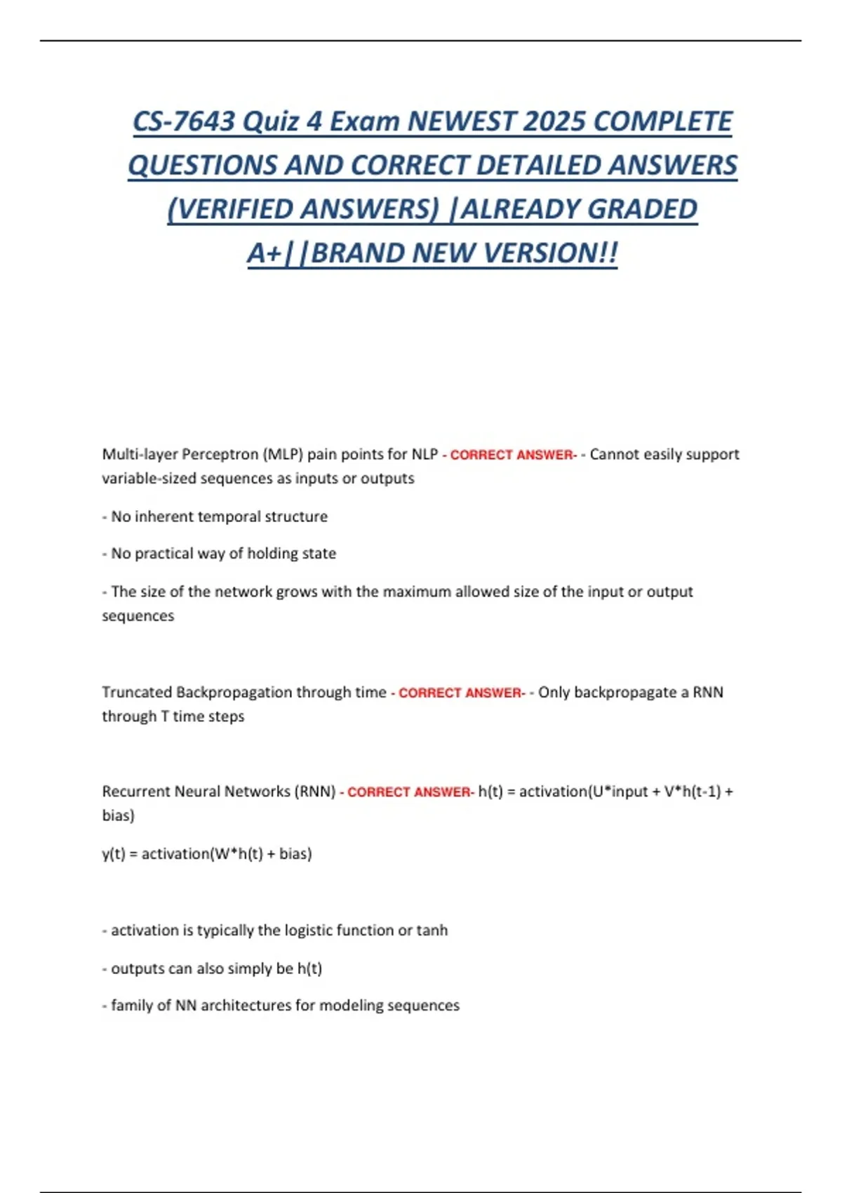 Recurrent Neural Networks (RNN) - CORRECT ANSWER- h(t) = activation(U*input + V*h(t-1) +