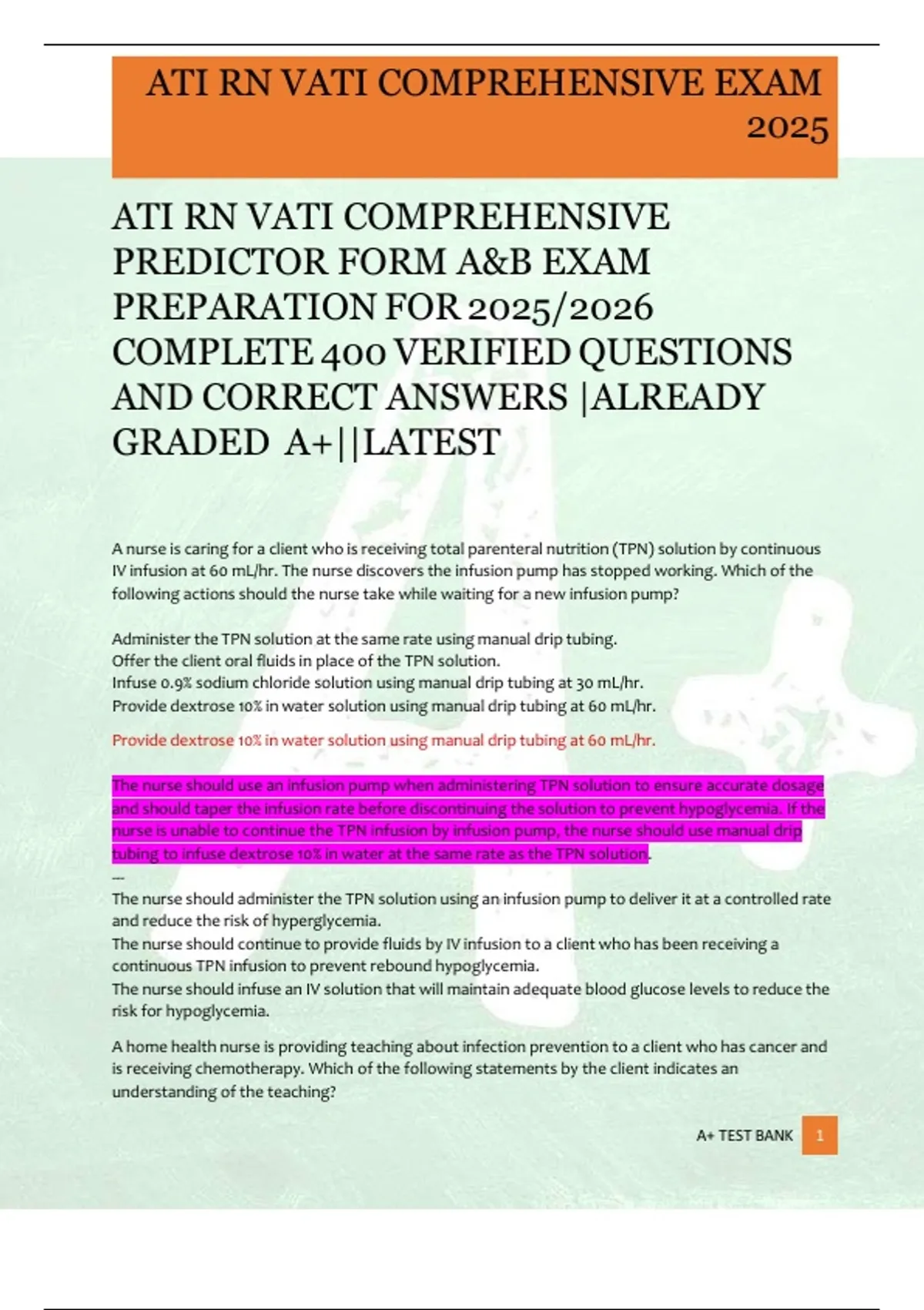 ATI RN VATI COMPREHENSIVE PREDICTOR FORM A&B EXAM PREPARATION FOR 2025/2026 COMPLETE 400 VERIFIED QUESTIONS AND CORRECT ANSWERS |ALREADY GRADED A+||LATEST ATI RN VATI COMPREHENSIVE EXAM 2025