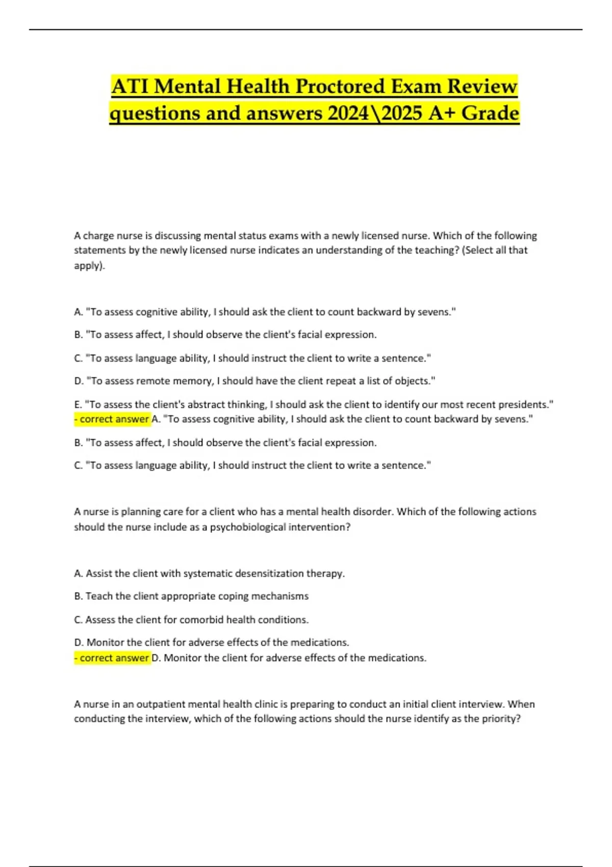 - correct answer A. "To assess cognitive ability, I should ask the client to count backward by sevens."