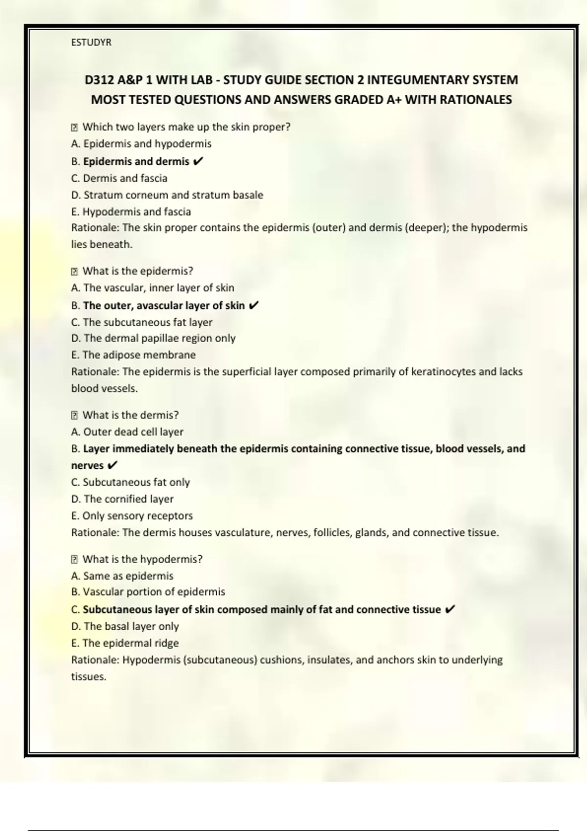 D312 A&P 1 WITH LAB - STUDY GUIDE SECTION 2 INTEGUMENTARY SYSTEM MOST TESTED QUESTIONS AND ANSWERS GRADED A+ WITH RATIONALES
