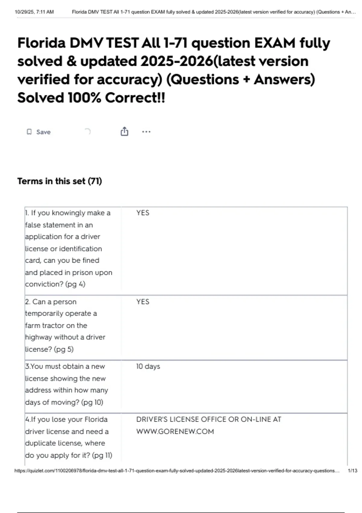 , 10/29/25, 7:11 AM Florida DMV TEST All 1-71 question EXAM fully solved & updated 2025-2026(latest version verified for accuracy) (Questions + An…