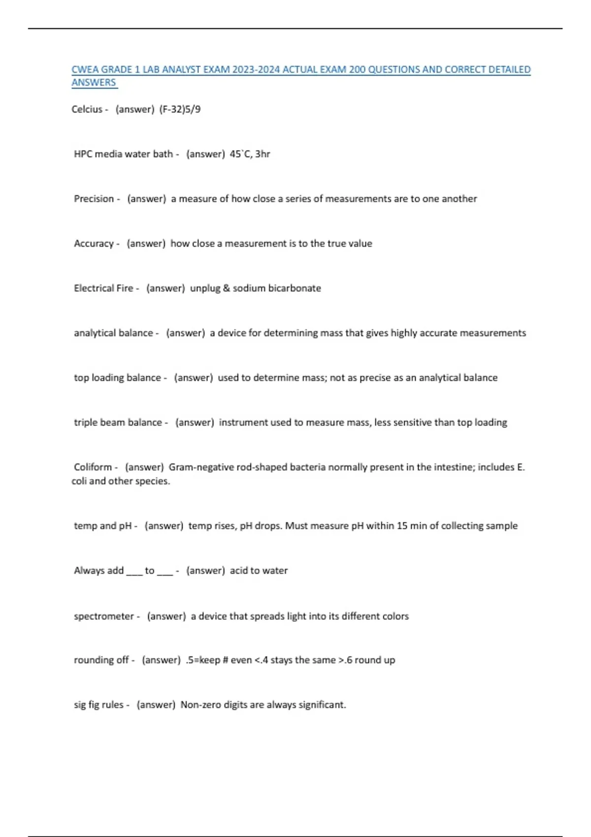 CWEA GRADE 1 LAB ANALYST EXAM 2023-2024 ACTUAL EXAM 200 QUESTIONS AND CORRECT DETAILED