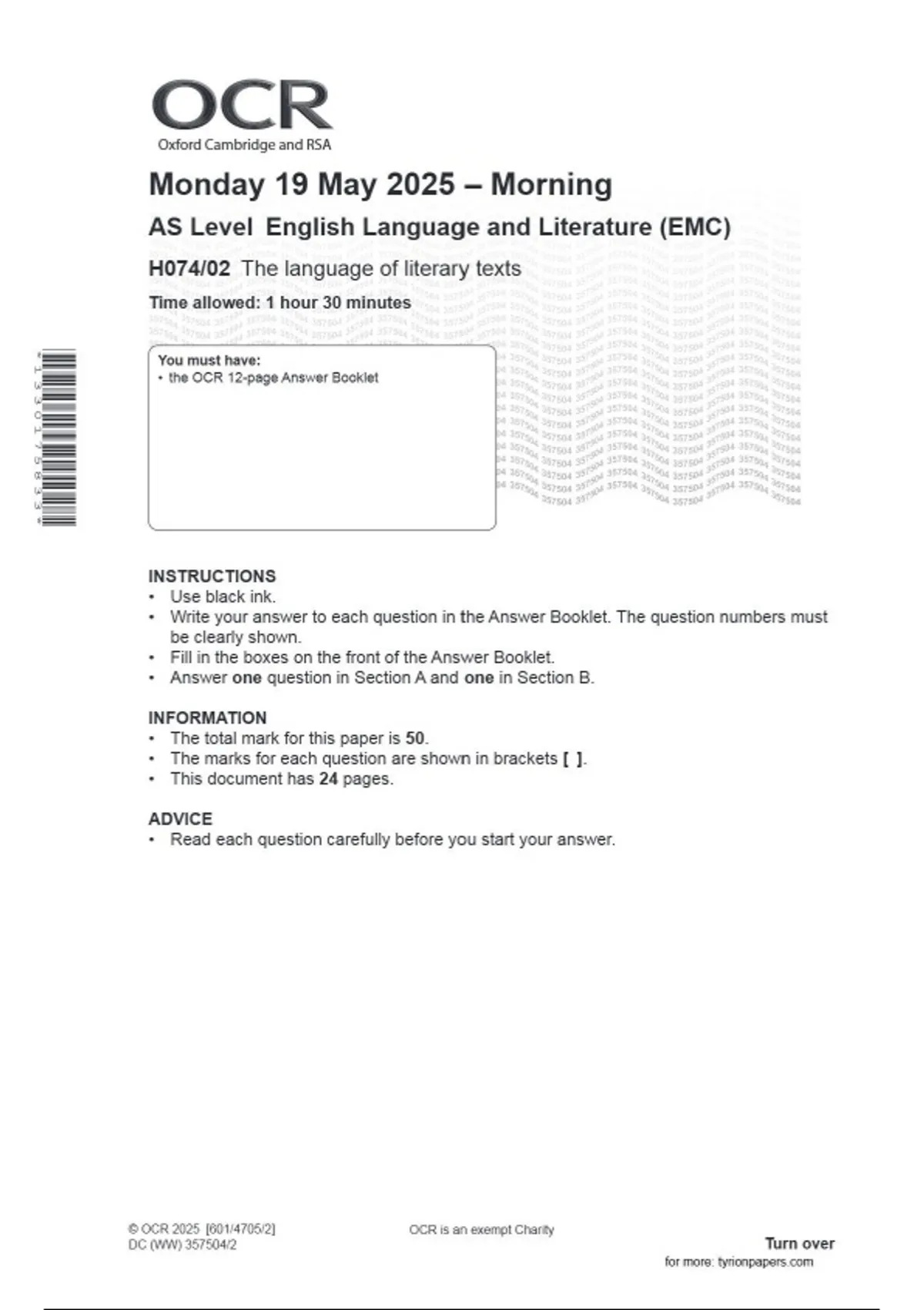 OCR AS Level English Language and Literature H074/02 JUNE 2025 QUESTION PAPER: The language of literary texts