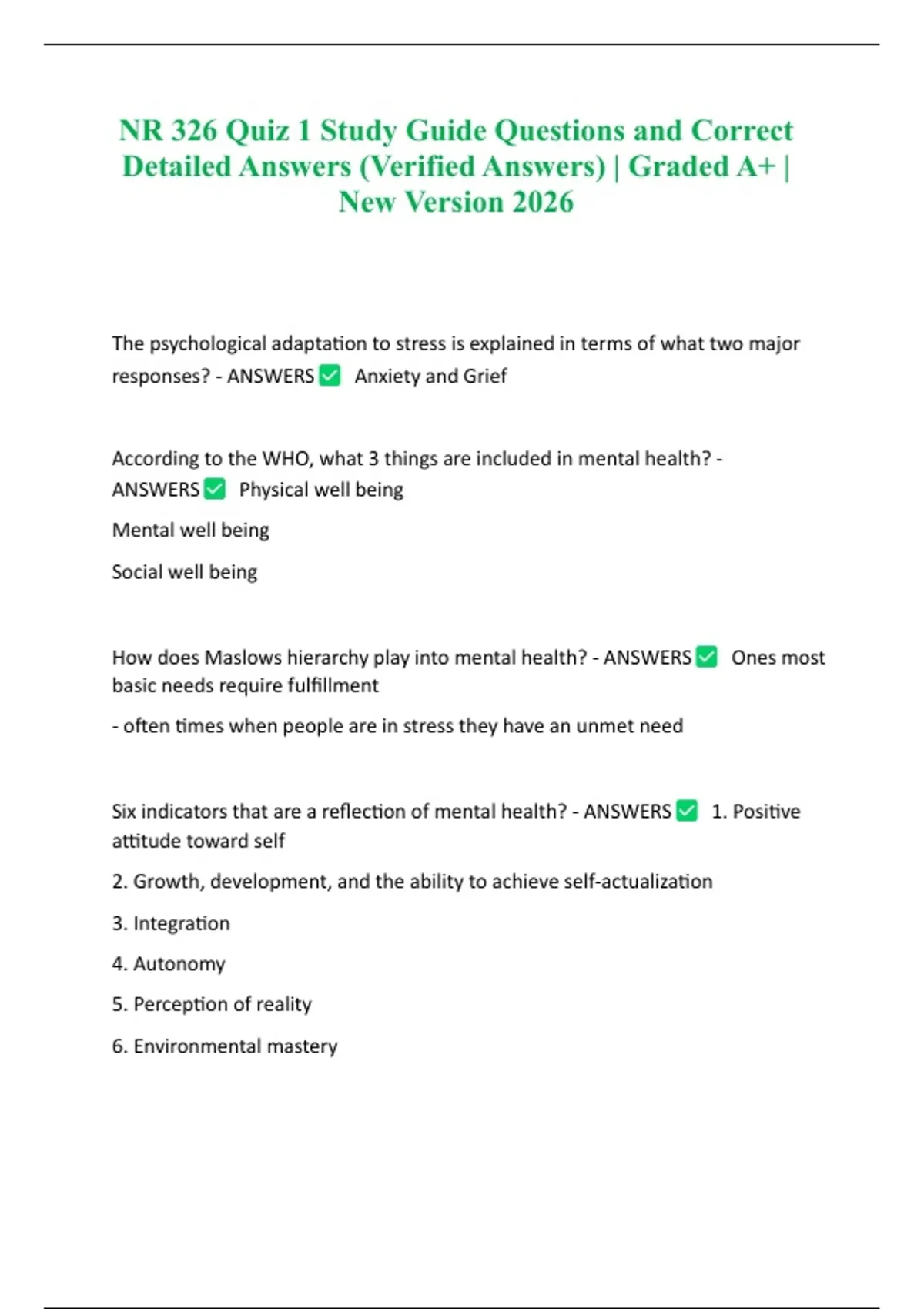 ,Mental health - ANSWERS Viewed as the successful adaptation to stressors