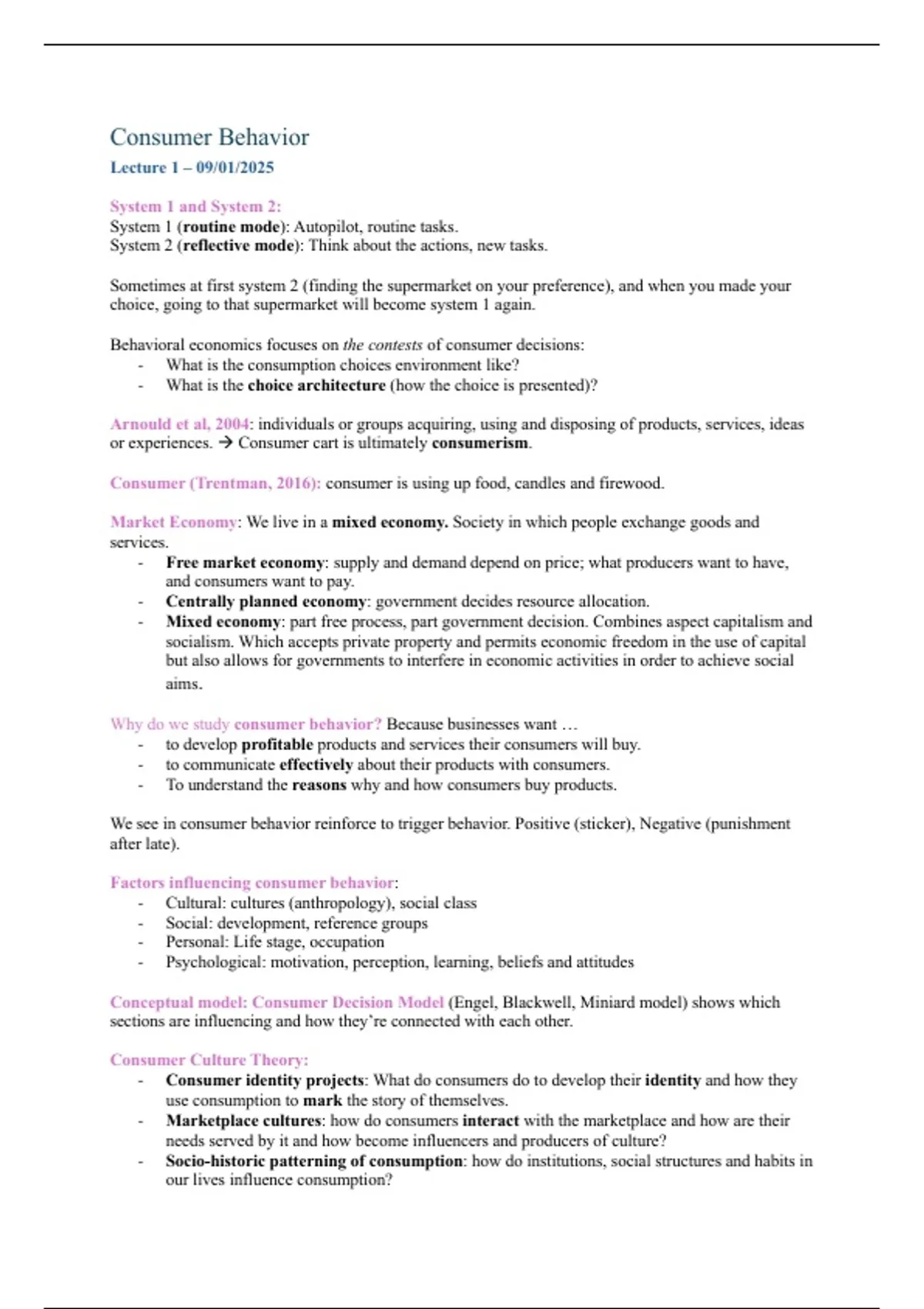 This document provides a comprehensive summary of all lectures for the course Consumer Behavior (FEB13012) at Erasmus University Rotterdam, covering material from January to February 2025. Topics include foundational behavioral economics, consumer decision-making models, cultural and psychological influences, heuristics and cognitive biases, perception, motivation, attitudes, and personality theories.