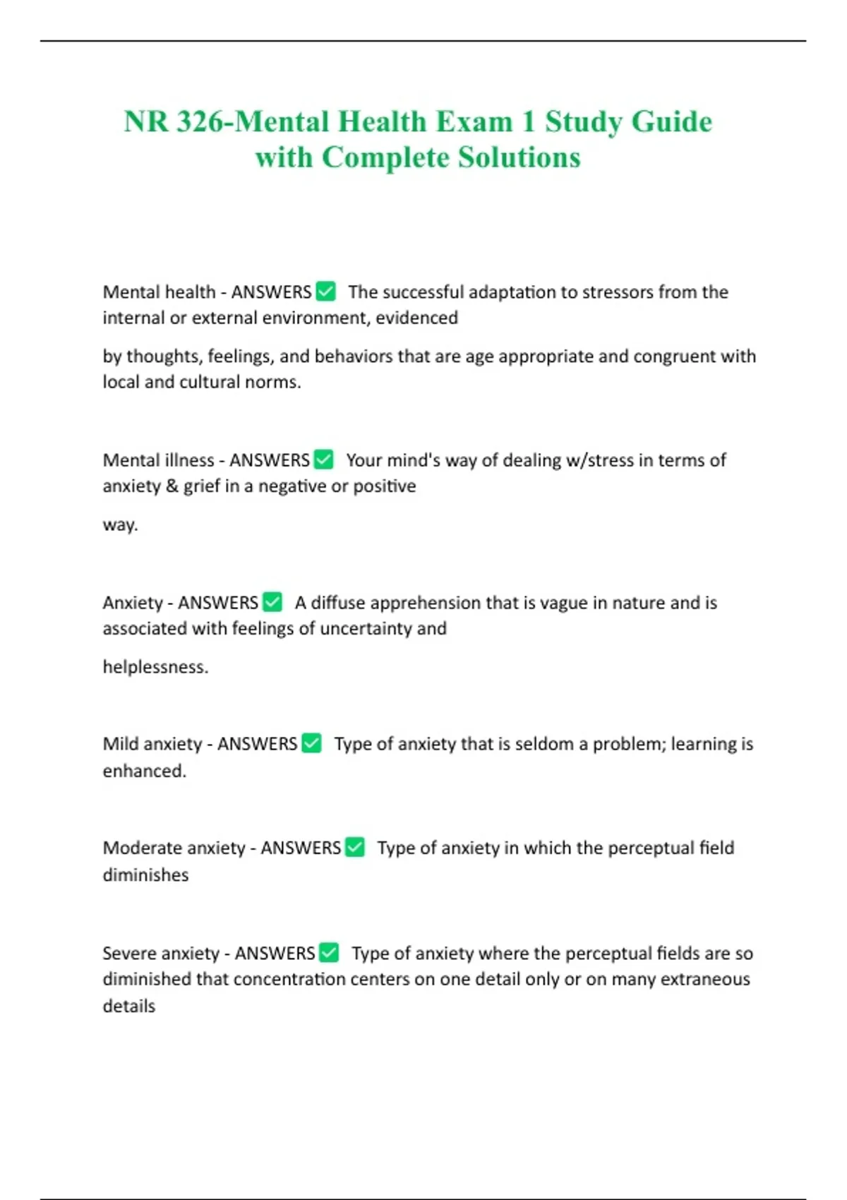 NR 326-Mental Health Exam 1 Study Guide with Complete Solutions