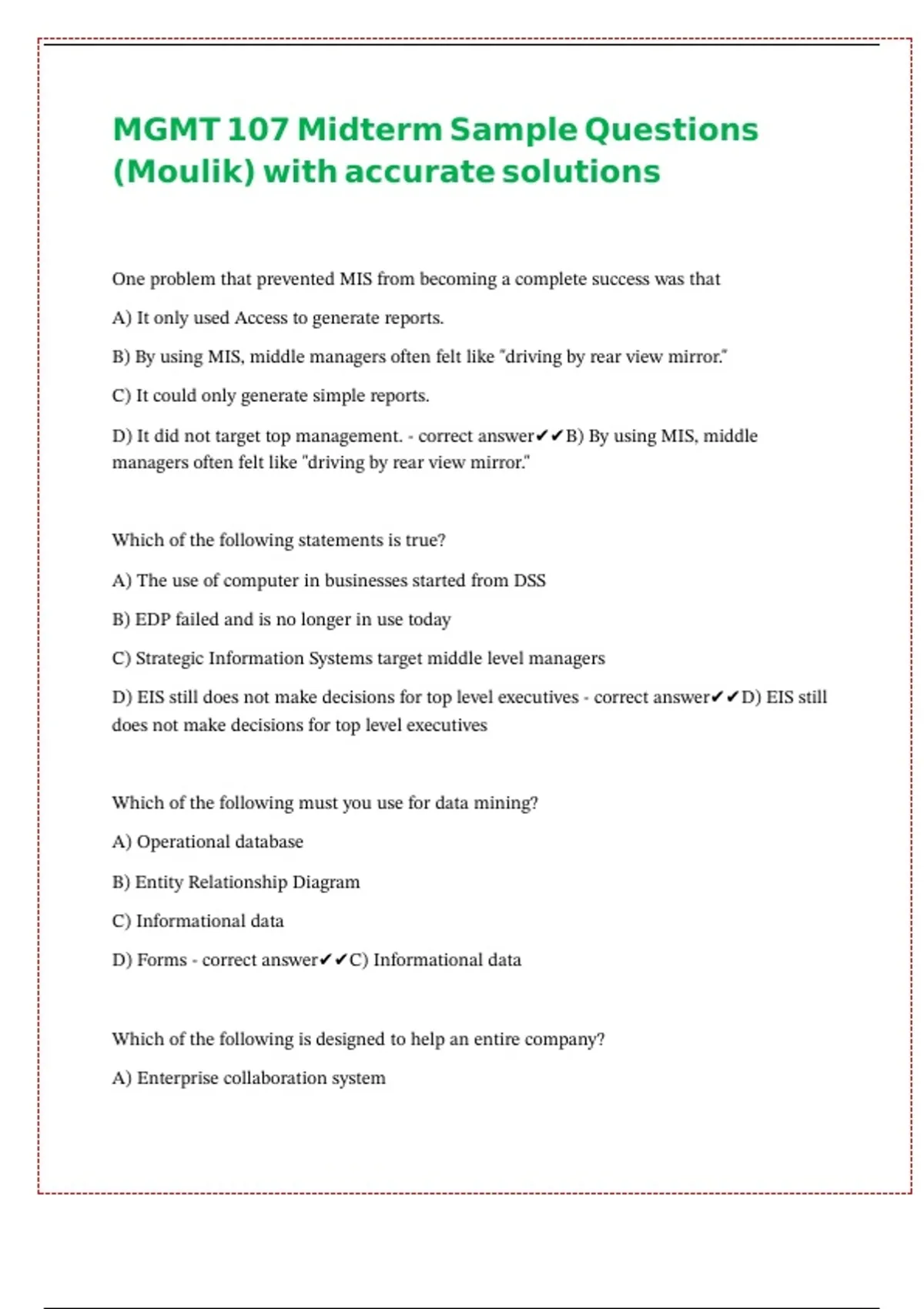 MGMT 107 Midterm Sample Questions (Moulik) with accurate solutions